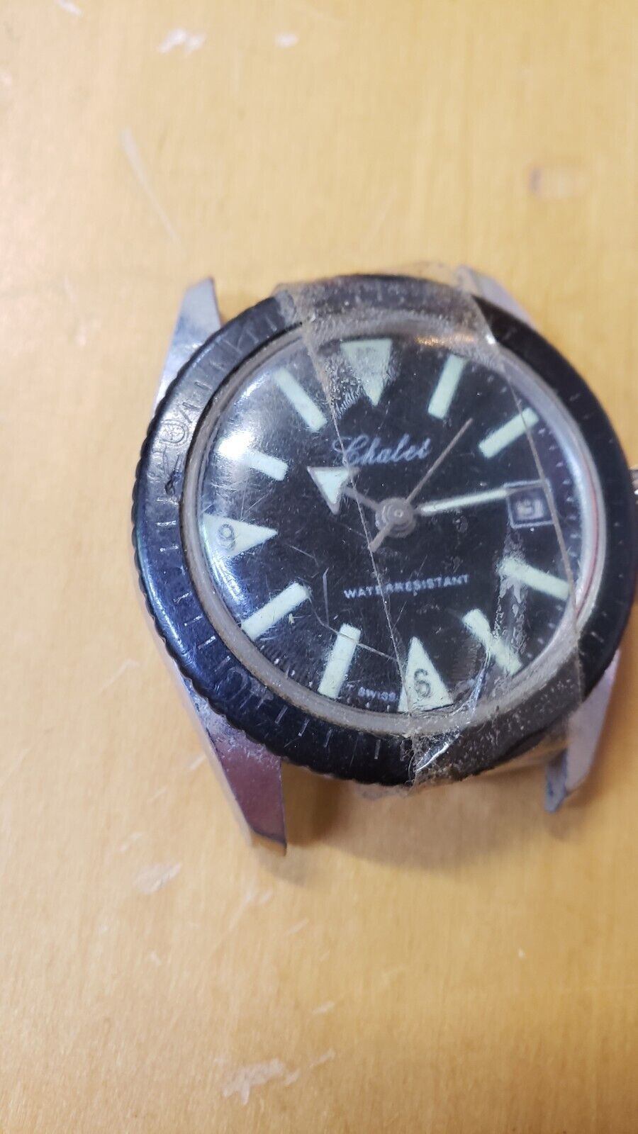 Rare Vintage 60's 70's Chalet Homme Plongeur Noir Vert Luminescent Montre Vitre