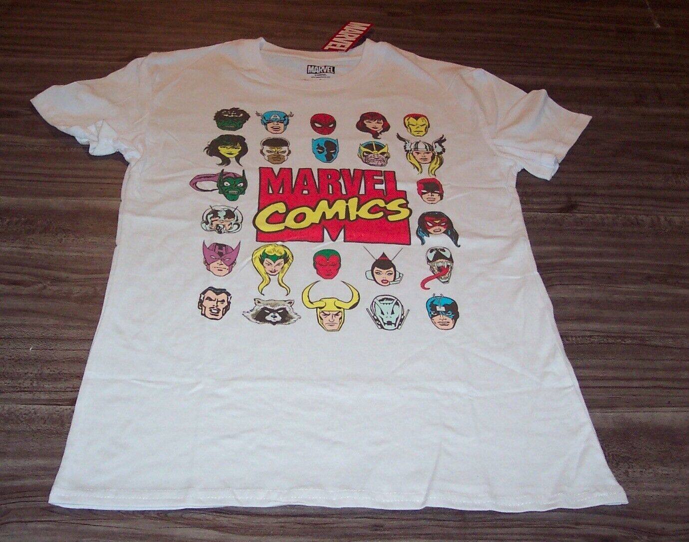 This is a VINTAGE STYLE MARVEL COMICS HEROES T-shirt. It is a size SMALL and it is NEW w/ TAG. It is 18 inches from armpit to armpit and 28 inches in length. Nice shirt with a ton of characters. Too many to even mention them all. DAREDEVIL, LOKI, THANOS, SHE HULK, THOS, HAWKEYE, GREEN GOBLIN, VENOM, SPIDER-MAN, DR. STRANGE, THE PUNISHER, HAWKEYE, THE INCREDIBLE HULK, THE BLACK PANTHER, IRON MAN, VISION, CAPTAIN AMERICA, ANT-MAN, and BLACK WIDOW. Officially Licensed. Combine auctions to save on shipping. AD
