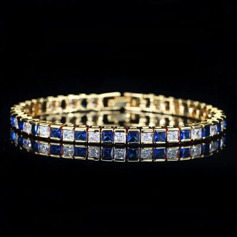 19ct Created Princess Diamond & Blue Sapphire Yellow Gold Plated Tennis Bracelet