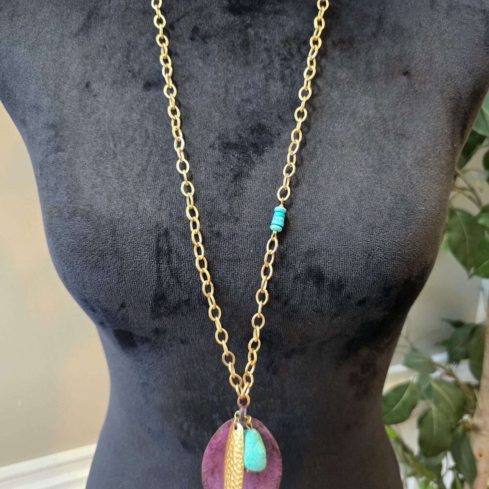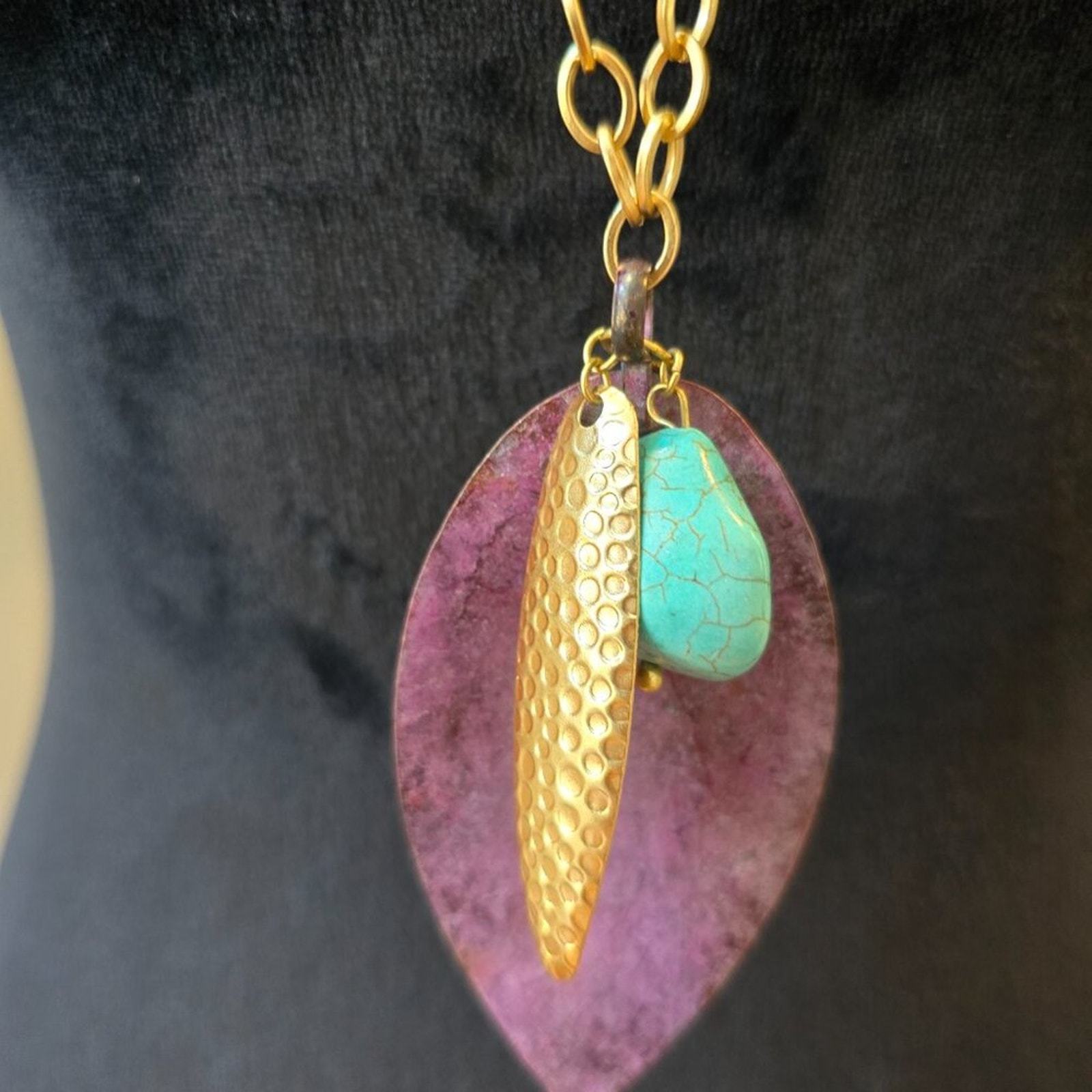 Chico's Green Turquoise Purple Opal Leaf Pendant Necklace w/ Lobster Clasp