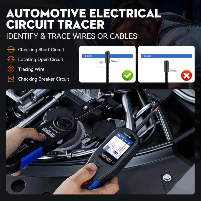 ?ALL-IN-ONE TOOL FOR ANY CIRCUIT PROBLEM DIAGNOSIS?V200 Pro covers all circuit tests: ?Circuit Breaker/Open Test ?Tracing Wire ?AC/DC Voltage Test ?Diode Test ?Resistance Test ?Polarity Test ?Continuity Test ?Ground Test ?Activate Components ?Signal Circuit Test ?Relay, Fuse, Trailer Light Test. You can quickly easily Locate short circuits, open connections, broken wires, current leaks and even trace wires. Get this essential circuit tester today and save your time and costly trip to a dealership!