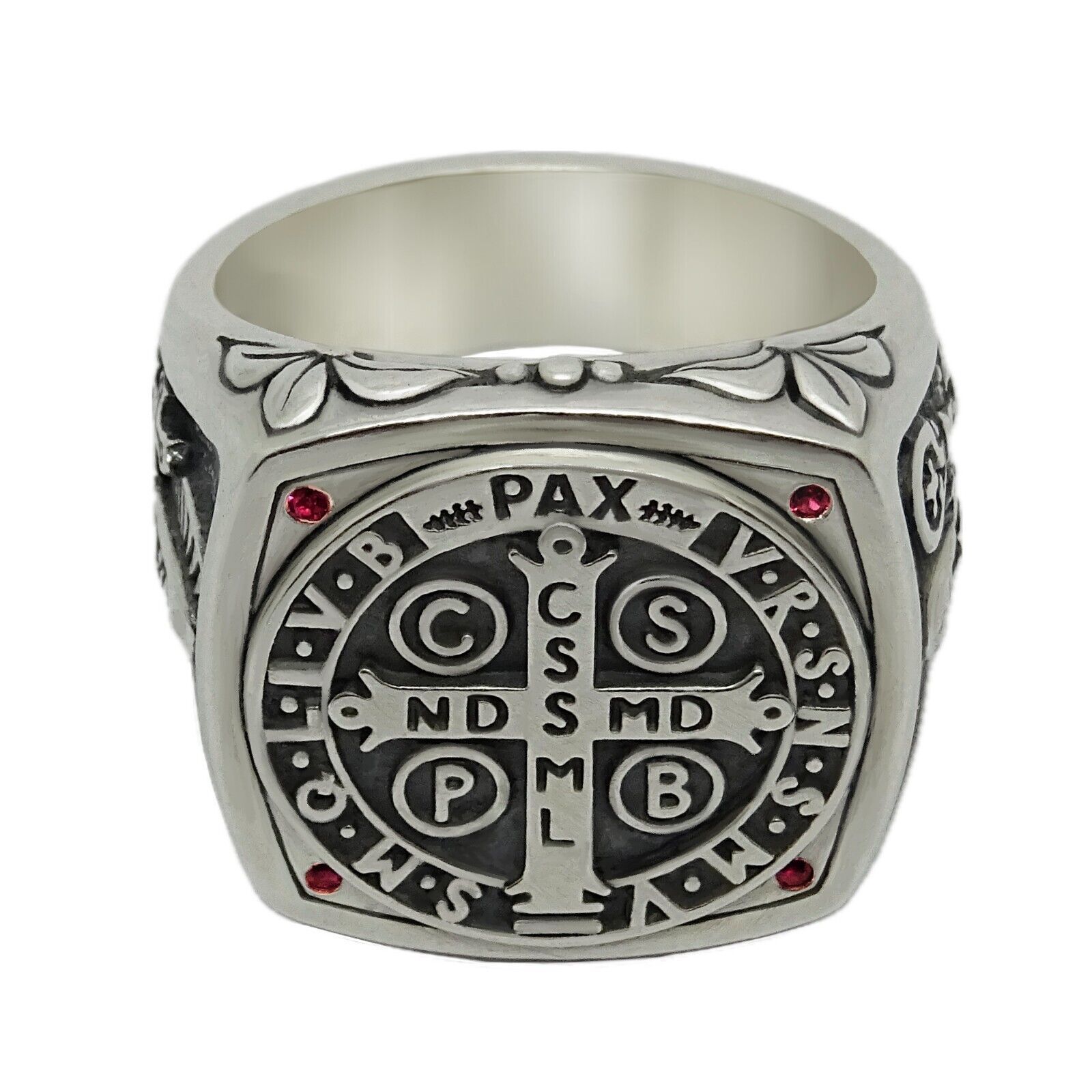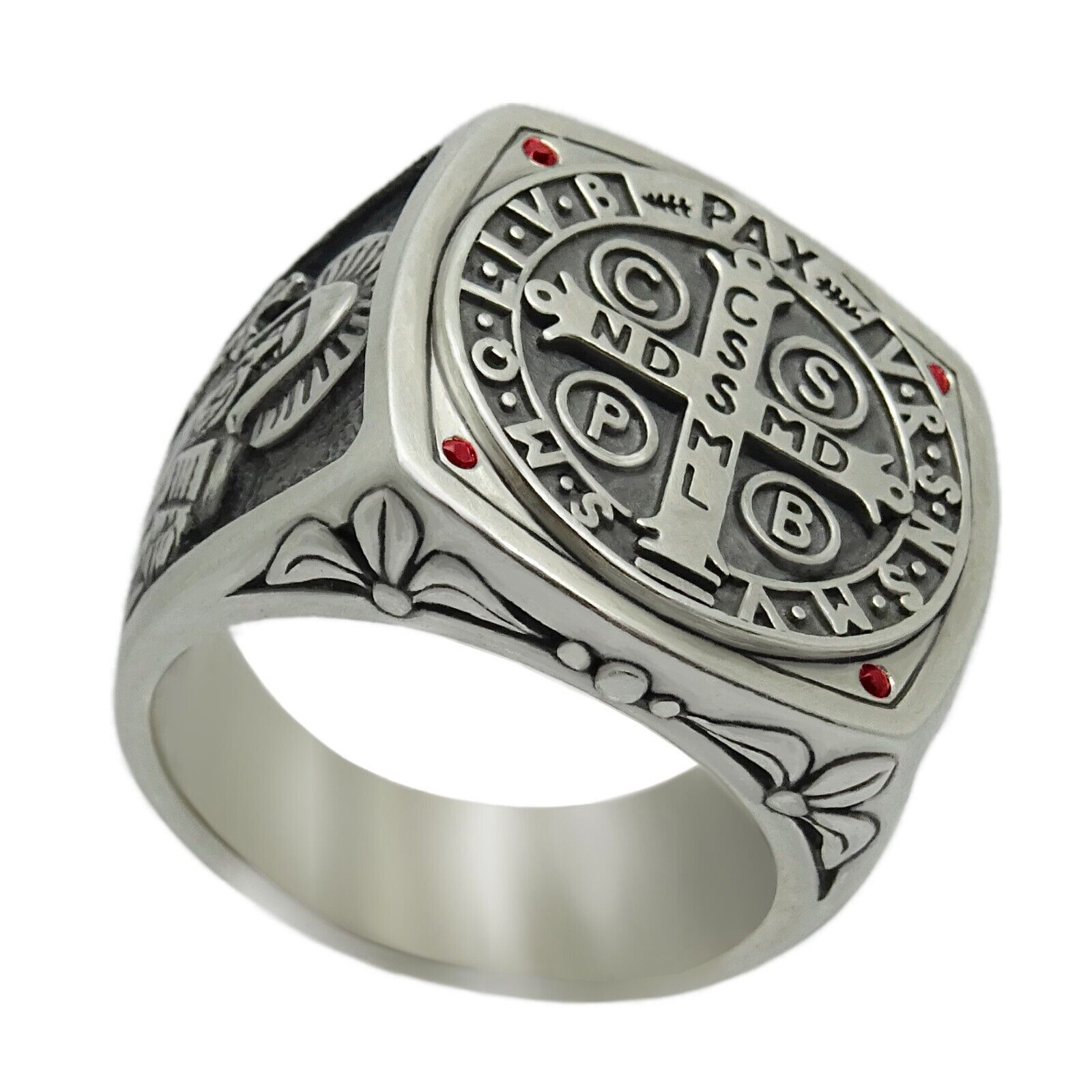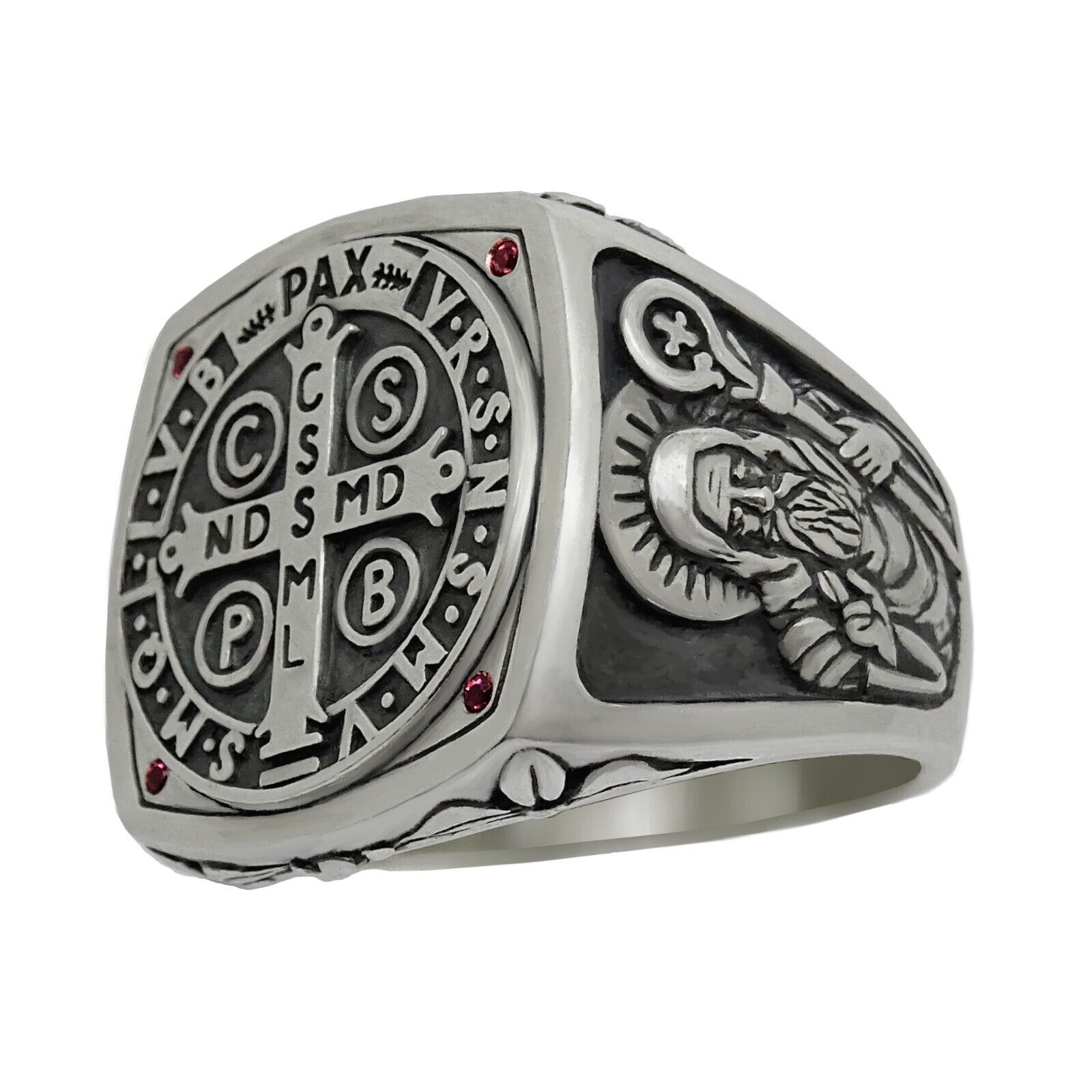 St Benedict Cross Medal Silver 925 Catholic Men's Ring Exorcism Demon Protection