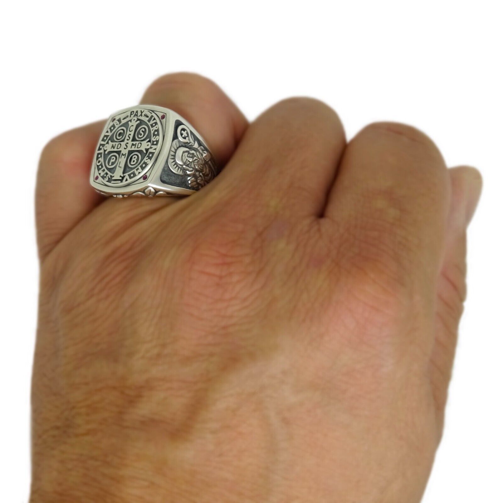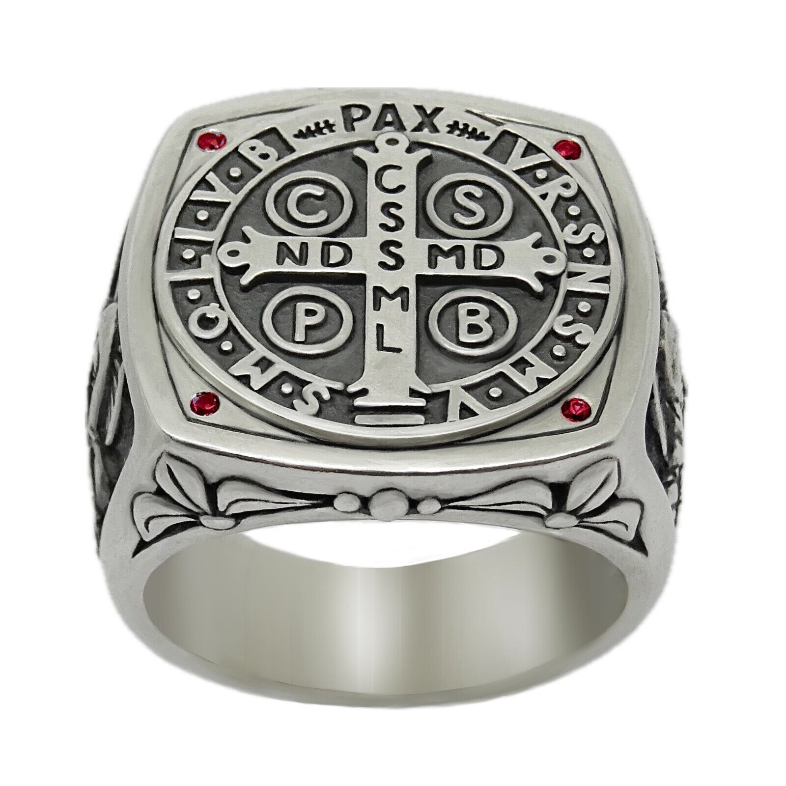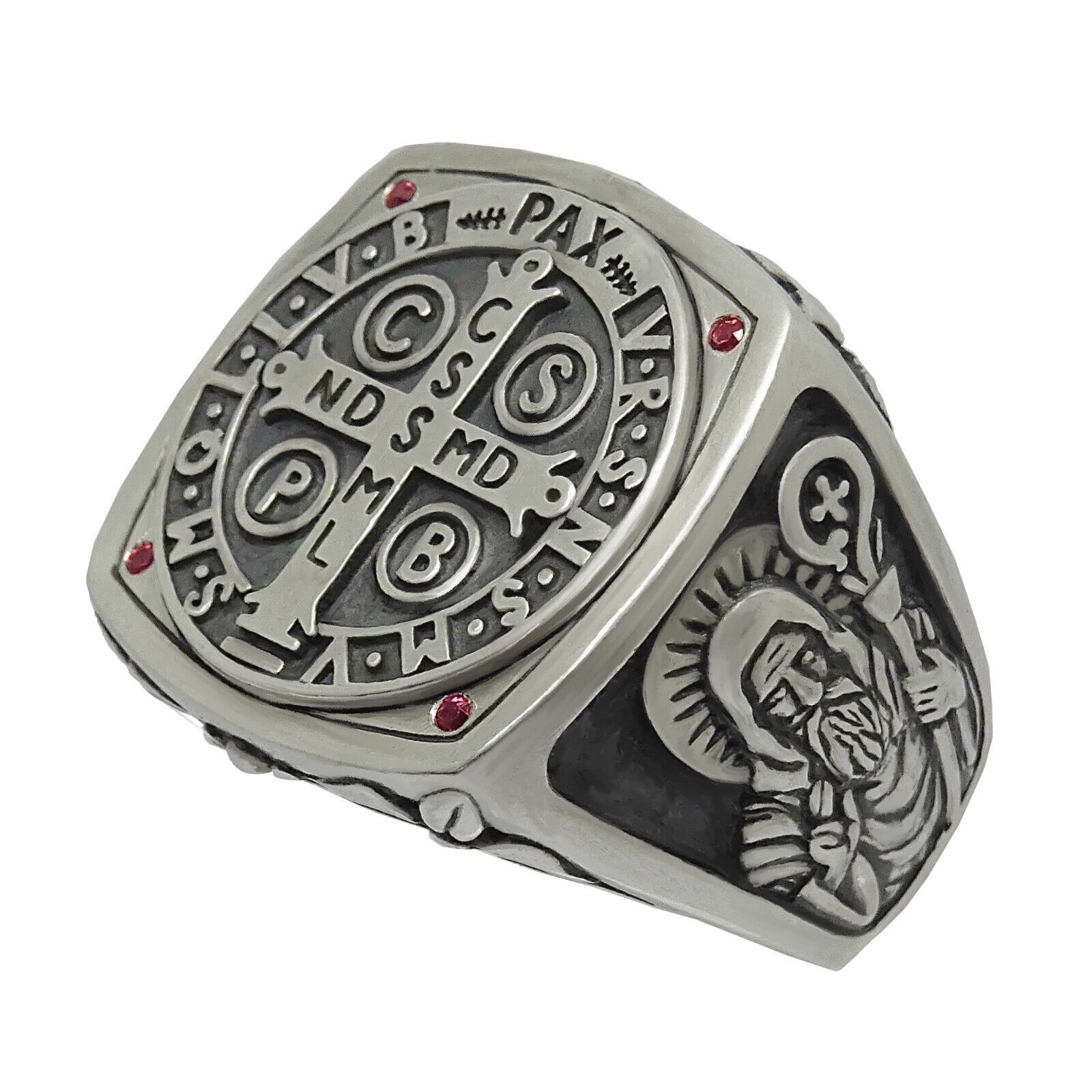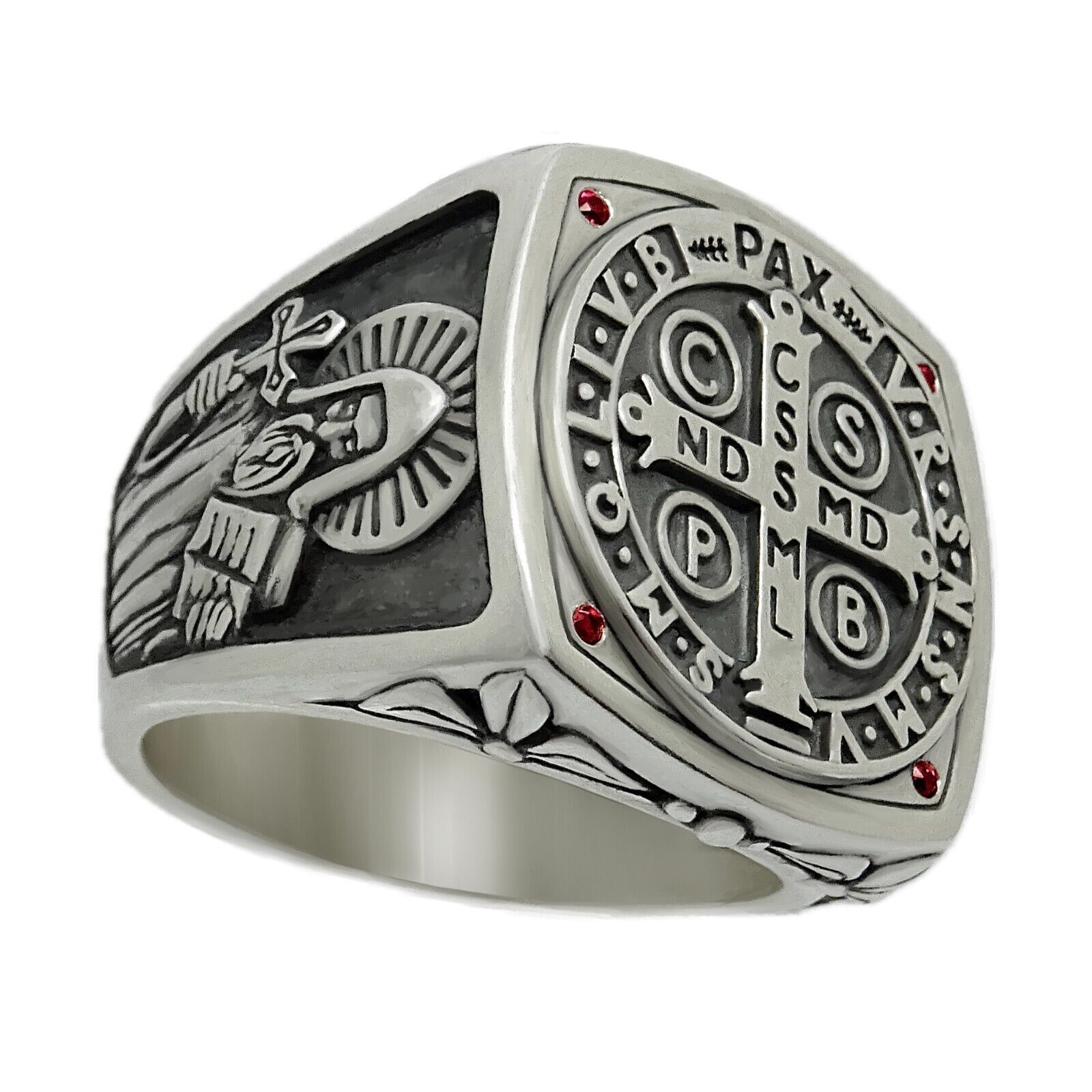 Handcrafted Christian Roman Catholic Saint Benedict Cross Medal men's ring