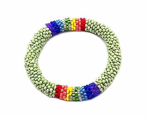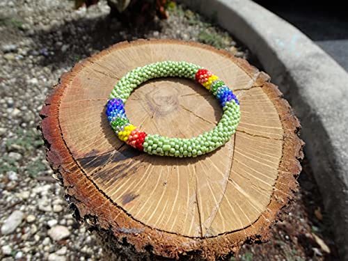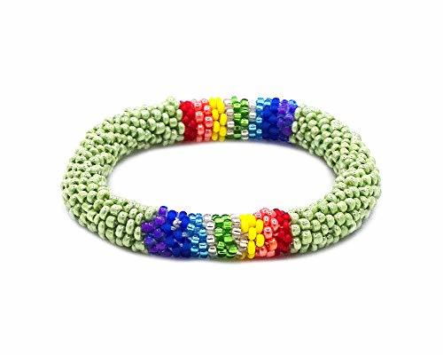 Product description: With extraordinary skill and patience, these bangles were crafted by hand, one seed bead at a time. This fashionable bracelet shines with vibrant colors and will illuminate your outfit.