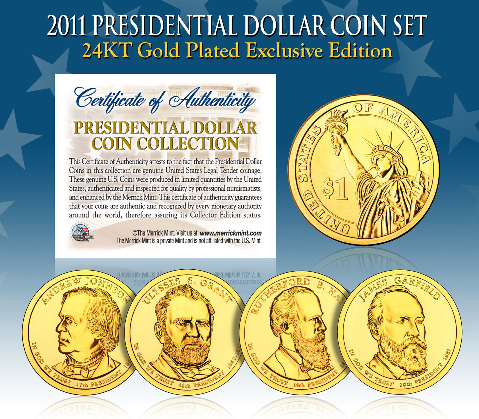 Here is your chance to own a complete set of four (4) 24KT Gold Plated 2011 Presidential $1 U.S. Coins featuring four U.S. Presidents: Johnson, Grant, Hayes, Garfield. Each coin is 24KT Gold Plated by the Merrick Mint to highlight the original design using a unique authentic process. The result is an everlasting 24KT Gold Plated coin collectible of ultra-high quality that is #1 in the industry. Each coin features a common reverse design of the Statue of Liberty and a unique Presidential portrait design on the obverse. Each coin is genuine legal tender of the United States and comes in an acrylic coin holder and includes a Full Color 2-sided Certificate of Authenticity. The United States Mint issues four Presidential $1 Coins each year. These coins feature large, dramatic artwork and edge-incused inscriptions of the year of minting, or issuance, E PLURIBUS UNUM and the mint mark. The inscription IN GOD WE TRUST appears on the face of the coins. The size, weight and metal composition of the Presidential $1 Coins are identical to that of the Native American $1 Coins.