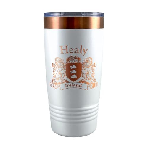Bullet point: Healy Irish Coat of Arms Travel Mug and Tumbler. Etched with the authentic Healy family Irish coat of arms, we expertly laser your surname and crest into the black and rose gold stainless steel mug. The vacuum insulation keeps beverages cooler or hotter longer, and it includes a removable lid with a secure latch. Experience the exquisite detail of your coat of arms through fine laser etching, revealed in stunning stainless steel.