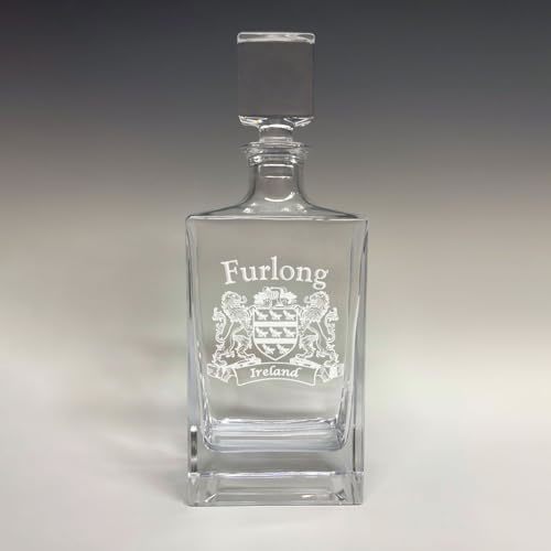 Product description: Furlong Irish coat of arms deluxe whiskey decanter with coat of arms - sand etched. Celebrate heritage and tradition with our stunning Whiskey Decanter adorned with your Irish Coat of Arms. This timeless piece adds elegance to any setting, making it a perfect gift for special occasions. Expertly crafted from durable, heavy liquor glass, it features a substantial 28.5 oz capacity and a sleek glass stopper lid. The intricate sand-etched design ensures lasting beauty, elevating your whiskey experience with sophistication and charm. Perfect for weddings, groomsmen, reunions, or any special occasion. Authentic Irish coats of arm with over 25 years of heraldry research. Heavy liquor glass decanter and glass stopper lid. Size - 9 1/4"(H) x 4 1/2"(L) x 2 1/2" (W). High quality permanent sand-etching and packaged in a sturdy black gift box with heavy EVA foam for protection.