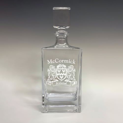 McCormick Irish coat of arms deluxe whiskey decanter with coat of arms - sand etched. Celebrate heritage and tradition with our stunning Whiskey Decanter adorned with your Irish Coat of Arms. This timeless piece adds elegance to any setting, making it a perfect gift for special occasions. Expertly crafted from durable, heavy liquor glass, it features a substantial 28.5 oz capacity and a sleek glass stopper lid. The intricate sand-etched design ensures lasting beauty, elevating your whiskey experience with sophistication and charm. Perfect for weddings, groomsmen, reunions, or any special occasion. Authentic Irish coats of arm with over 25 years of heraldry research. Heavy liquor glass decanter and glass stopper lid. Size - 9 1/4"(H) x 4 1/2"(L) x 2 1/2" (W). High quality permanent sand-etching and packaged in a sturdy black gift box with heavy EVA foam for protection.