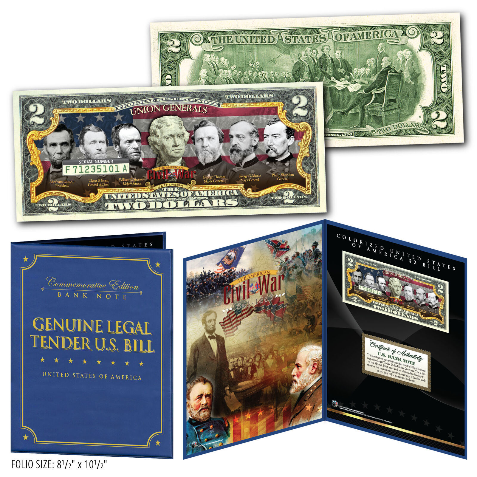 This Limited Collector Edition item features a Legal Tender Authentic Colorized AMERICAN CIVIL WAR ? UNION GENERALS Genuine $2 Bill. On the Left side is a Collector?s Edition 8 x 10 photo. Both items are beautifully showcased in a Special Gold Foil Museum-Quality Display Folio, that comes complete with Built-in Manufacturer's Certificate of Authenticity and Premium Collectors 8 x 10. This item Measures 10.5" x 8.5 (closed) and 10.5? x 17? (open). Each Premium Collector Display is a Limited Edition. Don?t Miss Your Chance to Order?Very Limited Quantity Available! Whether as a part of your growing collection or a gift to that great collector in your life, don't miss out on this incredible opportunity -- especially at this unbelievable value! Made in USA.