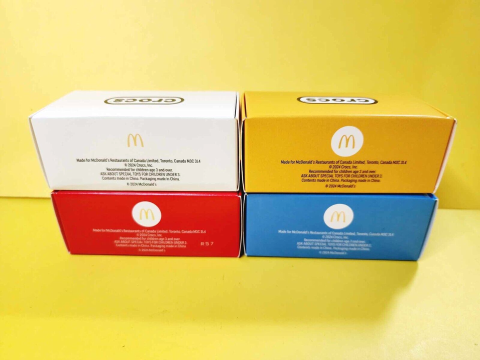 COMPLETE CANADIAN MCDONALD'S CROCS KEYCHAIN TOY SET 4x LOT YELLOW+BLUE+WHITE+RED