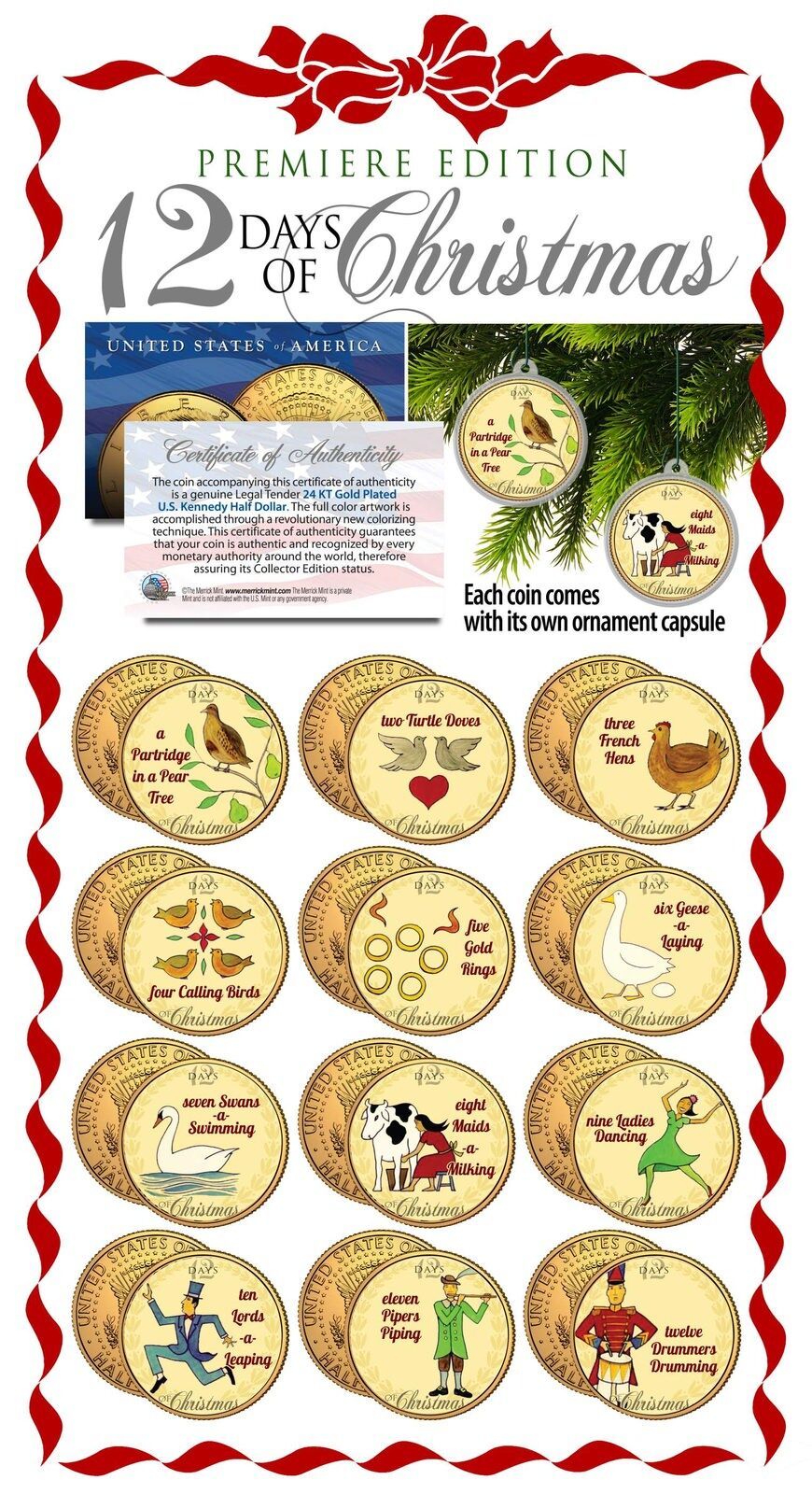 Here is your chance to own THE TWELVE DAYS OF CHRISTMAS complete set of twelve (12) 24KT Gold Plated and colorized JFK Kennedy Half Dollars U.S. Coins. Each coin comes with a Christmas Tree Ornament coin capsule. These high-quality, genuine Legal Tender United States coins have been layered in Genuine 24 Karat Gold, and then colorized using a unique painstaking multi-color authentic process by the Merrick Mint. The 12-coin set comes with a Certificate of Authenticity to guarantee that your coins are authentic and recognized by every monetary authority around the world, assuring its Collector Edition status. Colorizing coins involves the unique application of special inks directly to the surface of a coin that achieves a level of detail, color saturation, and durability that is #1 in the coin industry. The result is an everlasting colorized coin collectible of ultra-high quality.