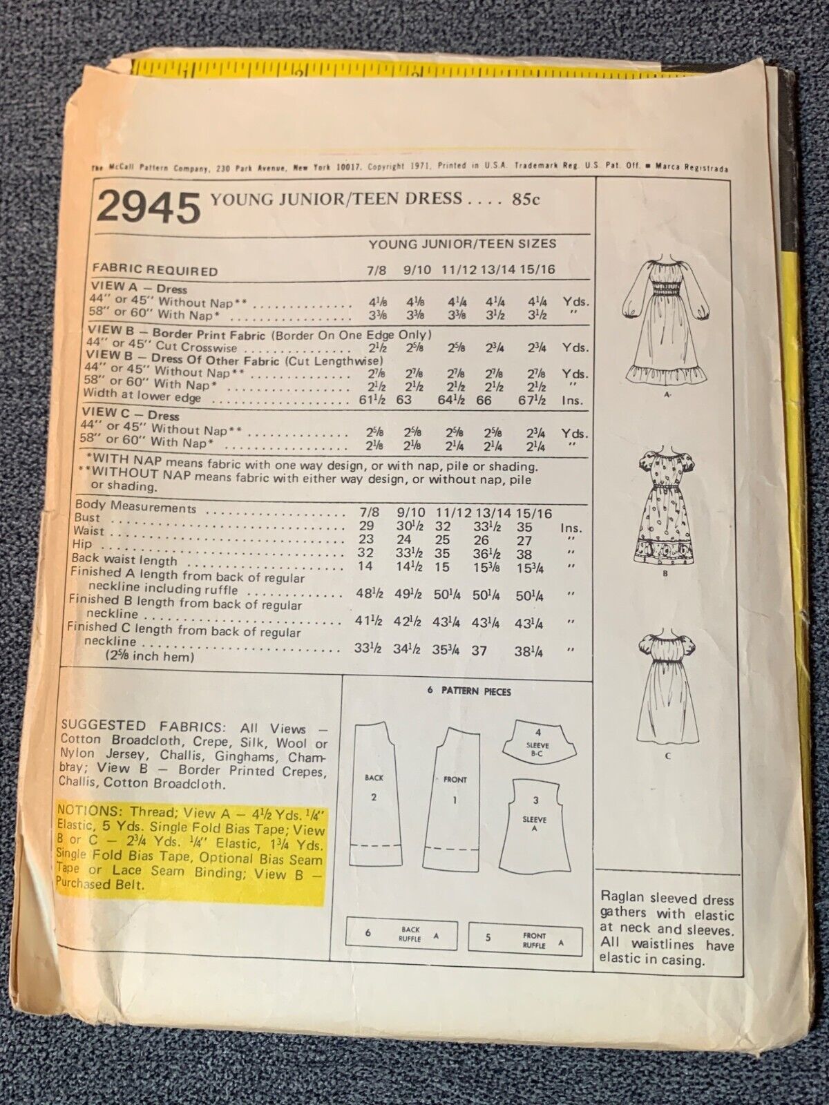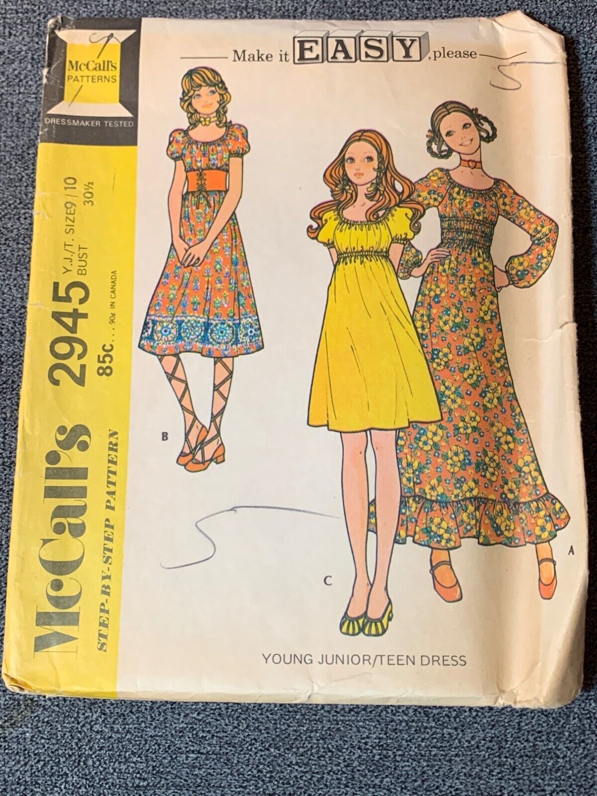 McCalls 2945 Vintage 1971 Sewing Pattern Junior/Teen Dress Sizes 9/10 uncut