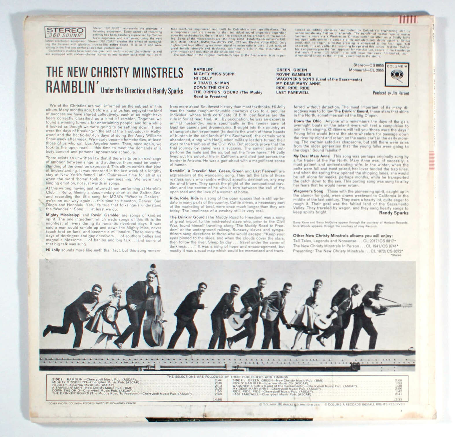 Ramblin', is an album by New Christy Minstrels, directed by Randy Sparks, its originator. In April 1963, following a successful appearance at the Latin Quarter in New York, the group recorded studio album, Ramblin'. This album included the song Green, Green, a McGuire/Sparks composition that became the group's first hit single, peaking at No. 3 on the Adult Contemporary Charts. Green, Green sold more than one million copies in 1963 and was awarded gold status. "There exists an unwritten law that if there is to be an exchange of emotion between singer and audience, there must be understanding of the emotion expressed. This album carries that kind of understanding. It was recorded in the last week of a lengthy stay at New York's famed Latin Quarter - a time for all of us when the word home took on new meaning. We were truly singing emotion, not just words in songs." (liner notes)