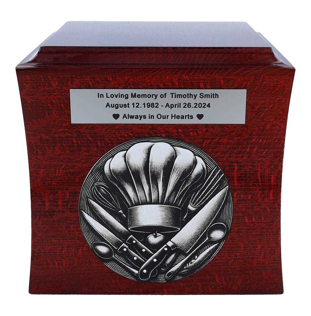 This urn features a polished mahogany finish, providing a timeless and dignified appearance. The slightly rounded edges add a touch of modern elegance. The front of the urn is adorned with an intricate engraving of kitchen utensils, symbolizing the love for cooking. Additionally, a personalized memorial plaque allows for custom text, such as the name of your loved one, important dates, or a heartfelt message, making this urn a unique and meaningful tribute.