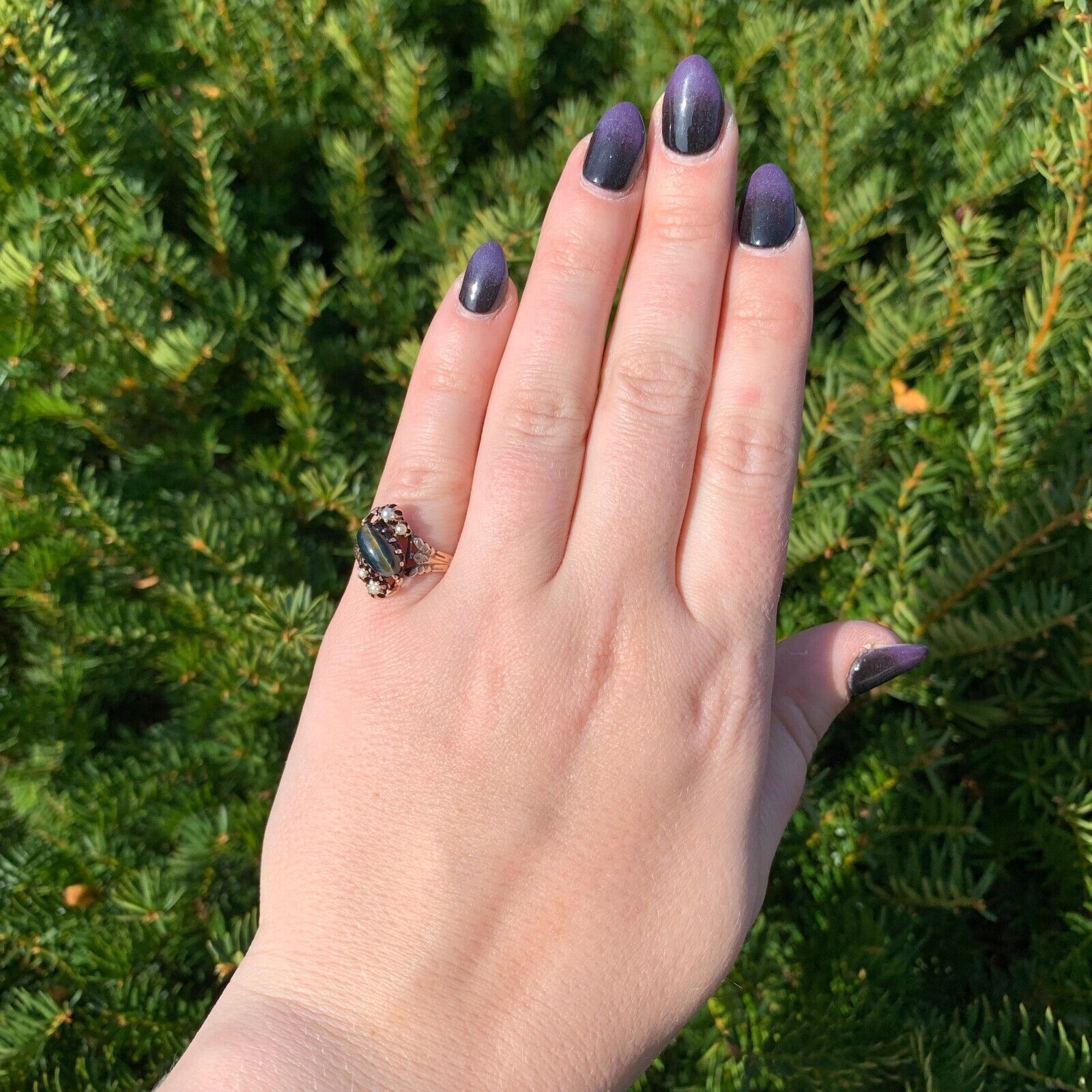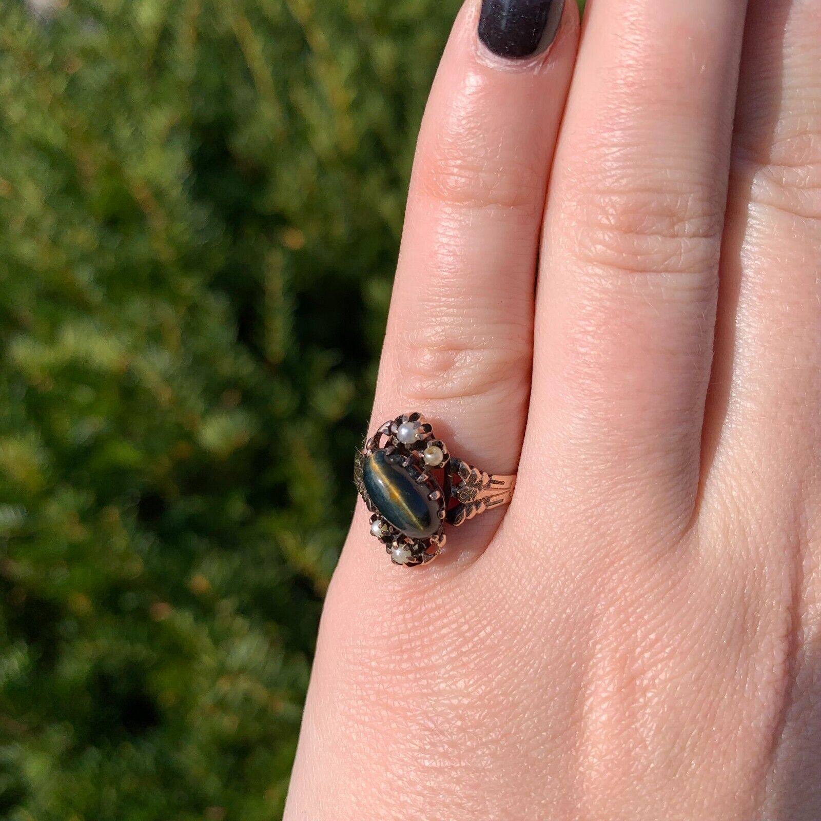 Victorian 10k Rose Gold Tiger's Eye Quartz and Pearl Ring Size 6.25 (#J7078)