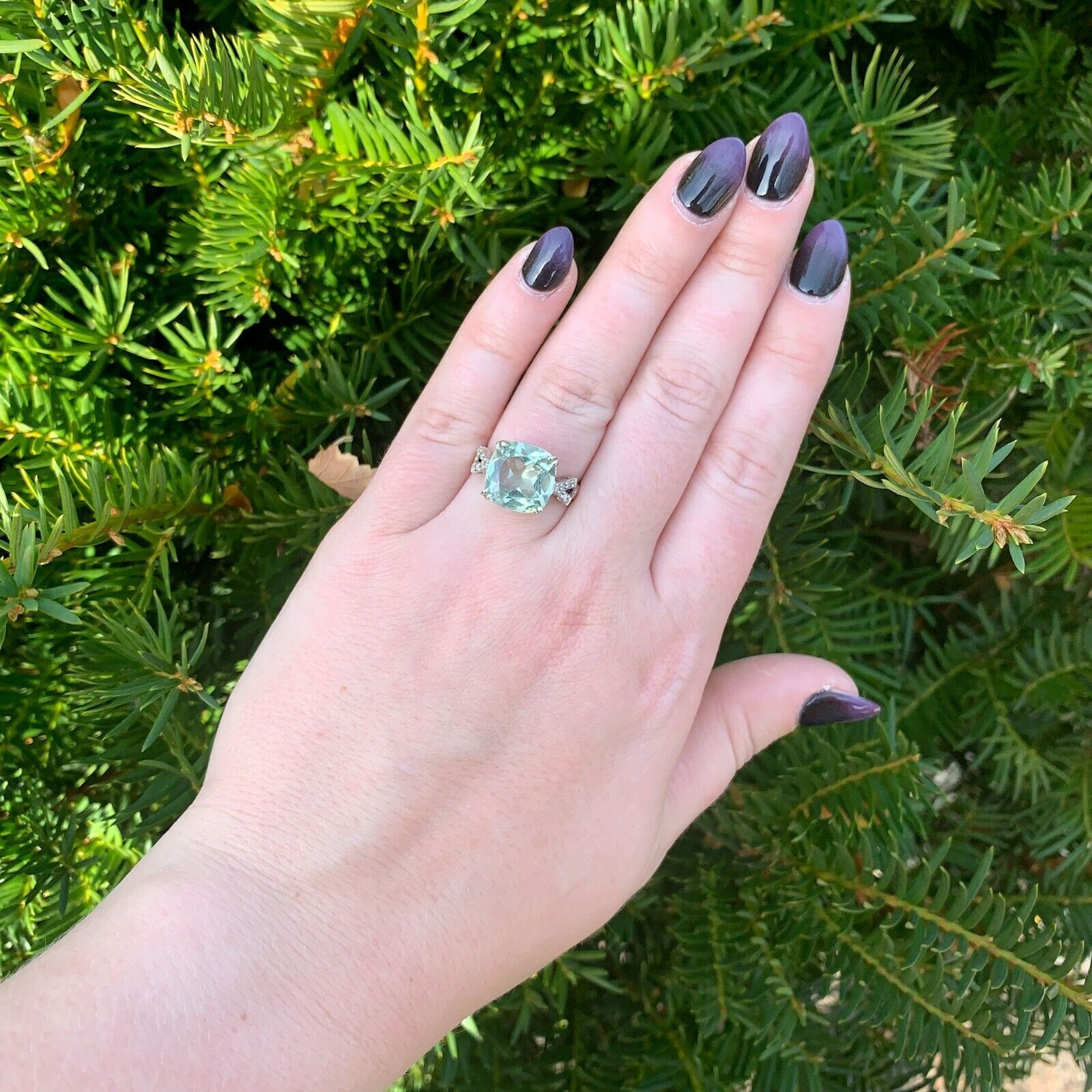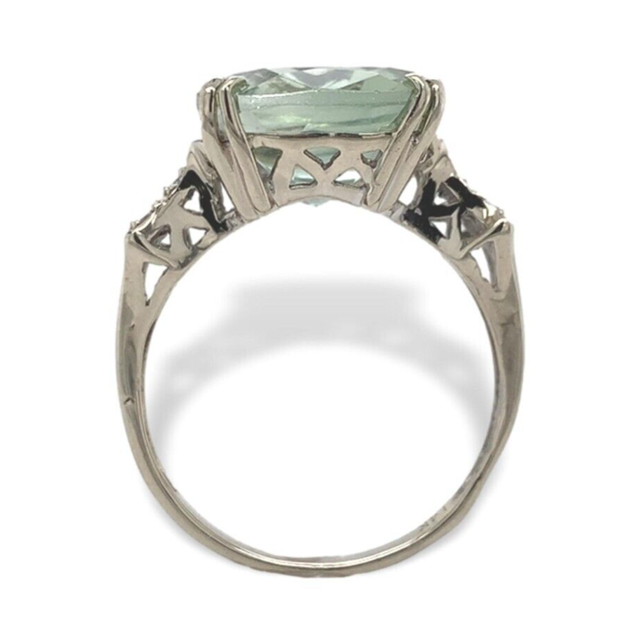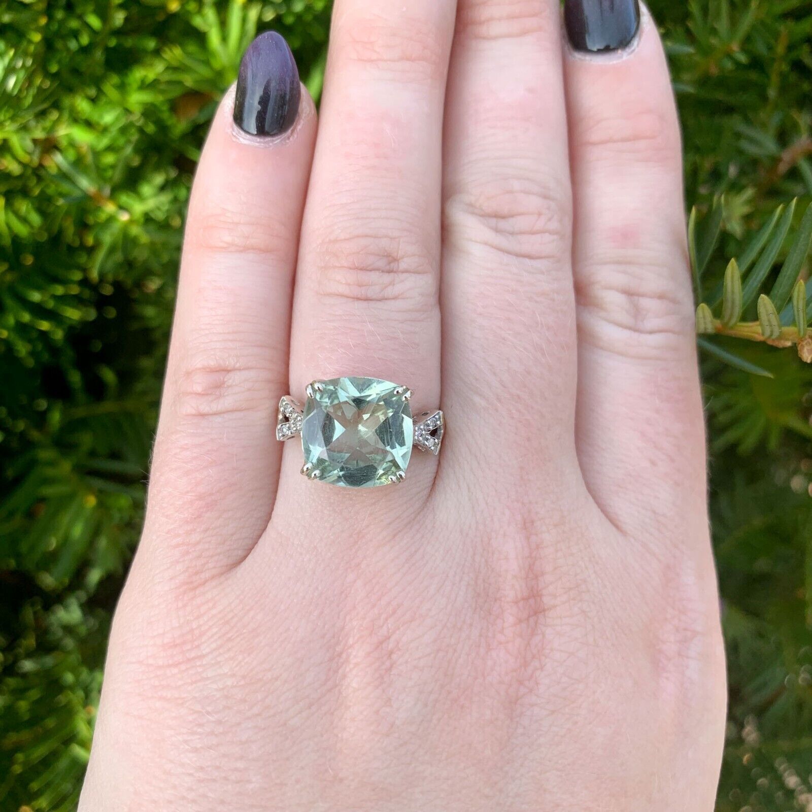 14k white gold prasiolite and diamond ring. Prasiolite is light green quartz, sometimes referred to as green amethyst. The cushion cut stone measures about 12mm. There are scratches on the stone from wear. There are six tiny round diamond accents.
