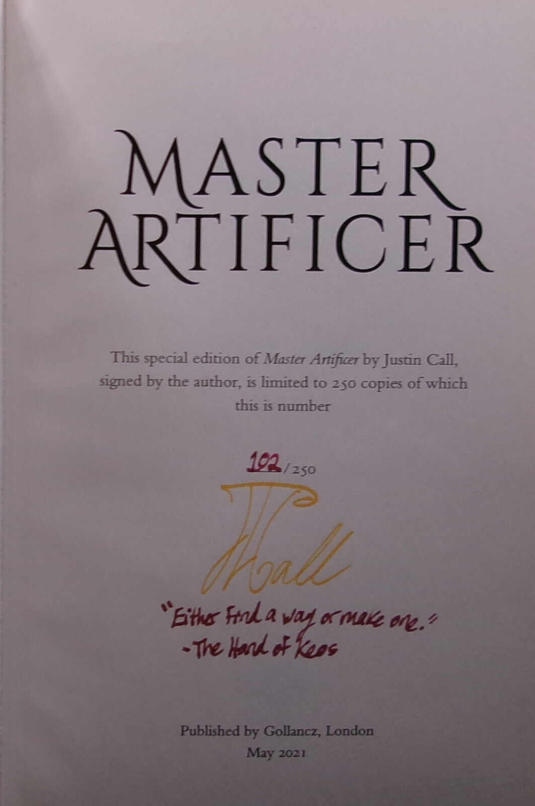 Justin Call MASTER ARTIFICER First edition SIGNED British Limited Fine Fantasy