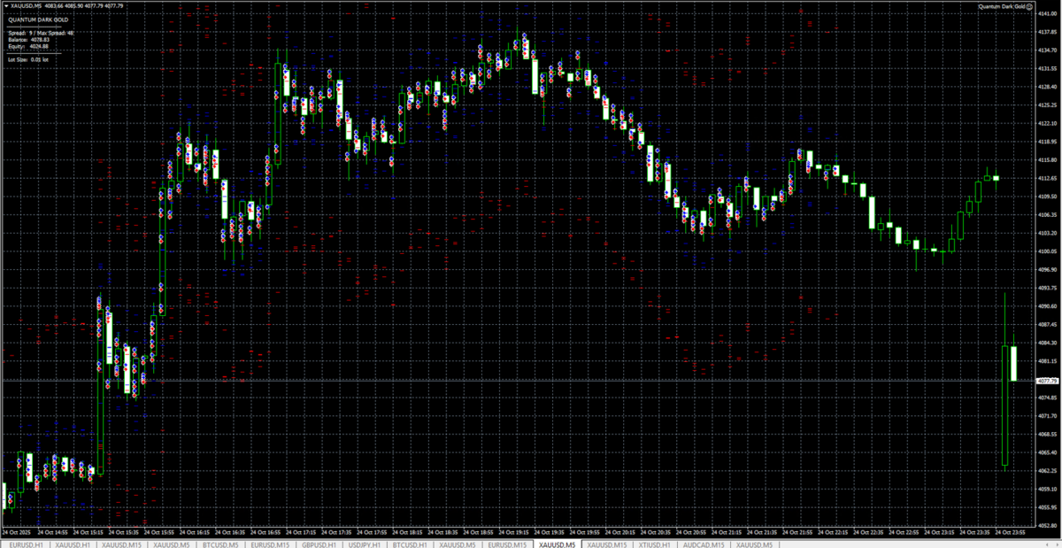Quantum Dark Gold is an advanced Expert Advisor for the MetaTrader 4 platform, built on the principle of quantum superposition combined with a dual-signal trading model. It simultaneously places Buy Stop and Sell Stop orders for each trading signal, allowing the prevailing market momentum to determine which direction activates. Once one order is triggered, the other is automatically canceled, creating a precise and adaptive entry system. The EA manages open positions with intelligent trailing, stop loss, and balancing mechanisms to control risk and optimize performance across gold (XAUUSD) markets.