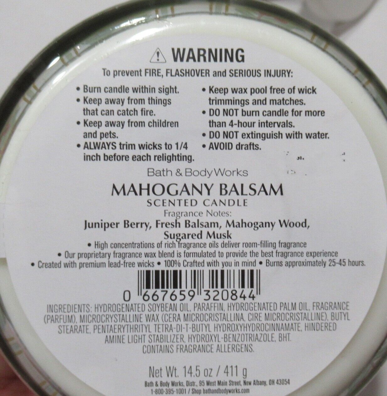 WARNING: To prevent fire and serious injury: Burn candle within sight. Keep out of each of children and pets. Never burn candle on or near anything that can catch fire. Trim wick to 1/4 inch before each relighting. Keep all objects, including matches and wick trimmings, out of the candle. Do not burn candle for more than 3-4 hours at a time. Allow to cool before relighting. Keep out of drafts. DO NOT extinguish with water.