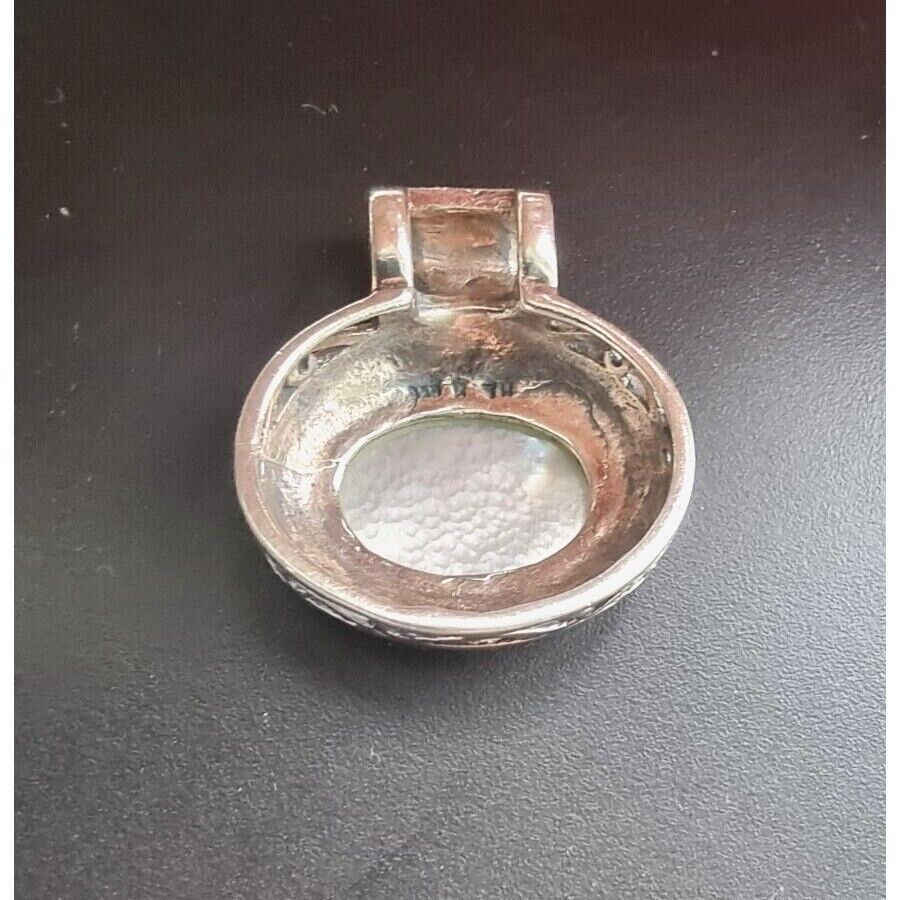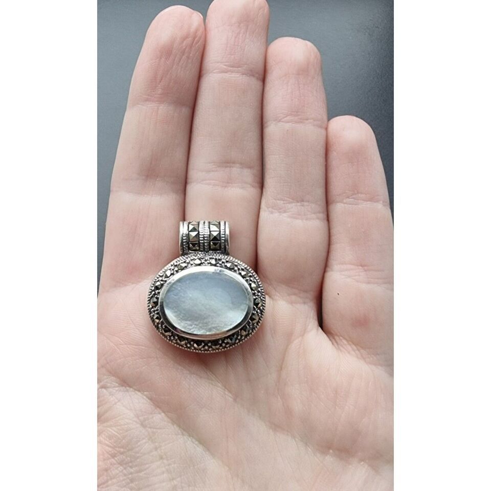 SIZE: APPROX. 1 '' x 1 1/4''BEATIFUL GIFT BOX INCLUDED!!! This vintage 925 sterling silver pendant features a stunning oval-shaped mother of pearl/abalone stone with natural creation and marcasite secondary stone. The pendant is signed by the brand TH and has a charming style that would make a perfect addition to any jewelry collection. The silver color of the pendant is complemented by the pearl and marcasite gemstones, creating a unique and elegant look. The pendant is crafted from high-quality sterling silver with 925 metal purity, ensuring durability and longevity. This pendant is a great choice for anyone who loves vintage jewelry and wants to add a touch of elegance to their outfit.