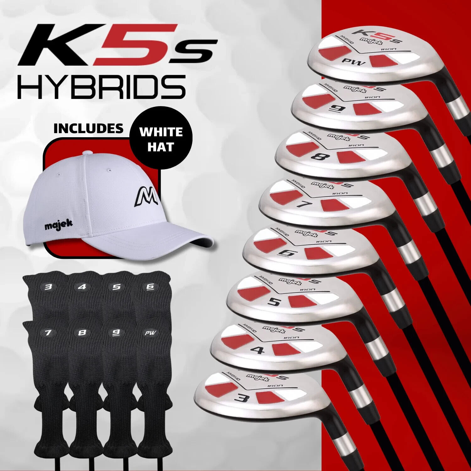 UPGRADE Your Entire difficult to use iron set with the Majek K5 all hybrid iron set! Majekally improve your Hybrid-Iron game! Pure Golf Engineering: Majek Hybrid was Co-Engineered by members of an elite engineering group. This unique relationship and pure engineering approach created the Majek All Hybrid Iron Set. Benefits of the Majek Hybrid: -More Weight Positioned Behind The "Sweet Spot" -Deeper Cavity Back Creates A Tighter Shot Dispersion, Which Increases The Accuracy On Off Center Hits. -Aerodynamic Design Creates A Reduction In Drag, Which Leads To Higher Club Head Speeds -Wide To Thin Crown Design Creates A Lower CG To Promote Higher Launch Angle For More Distance -Lightweight Premium Graphite Shaft Promotes Faster Swing Speed For Greater Distance. -Black Crown And Arrow Markers Make Alignment Easy And Eliminates Glare.Support A Local Company: Your Custom Made Majek Golf Hybrid Is Assembled By Hand In Riverside, CA, USA And Delivered Direct To Your Door.