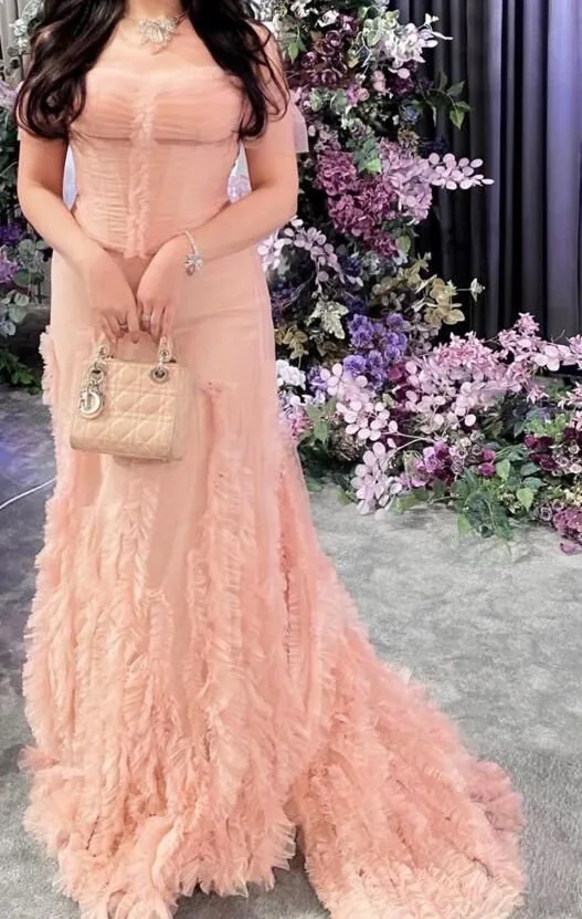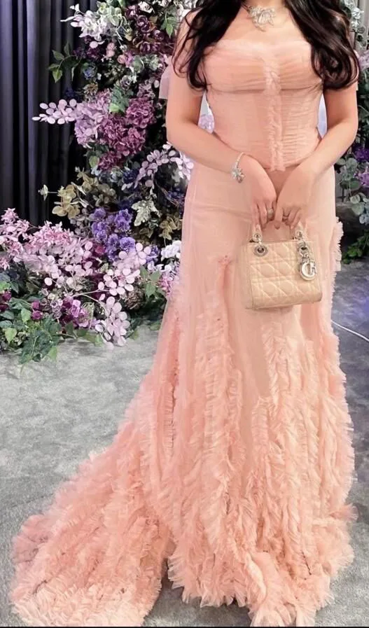 Spaghetti Strap Sheer Short Sleeve Court Train Tulle Luxurious Layers Evening Dr