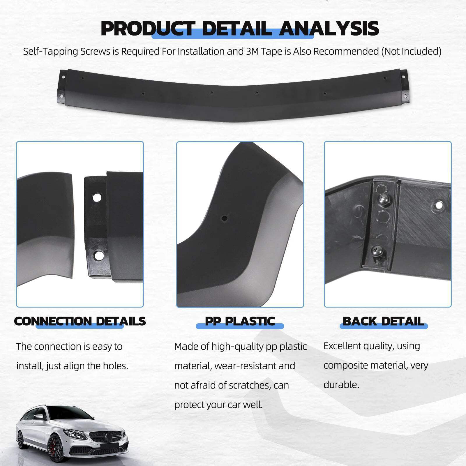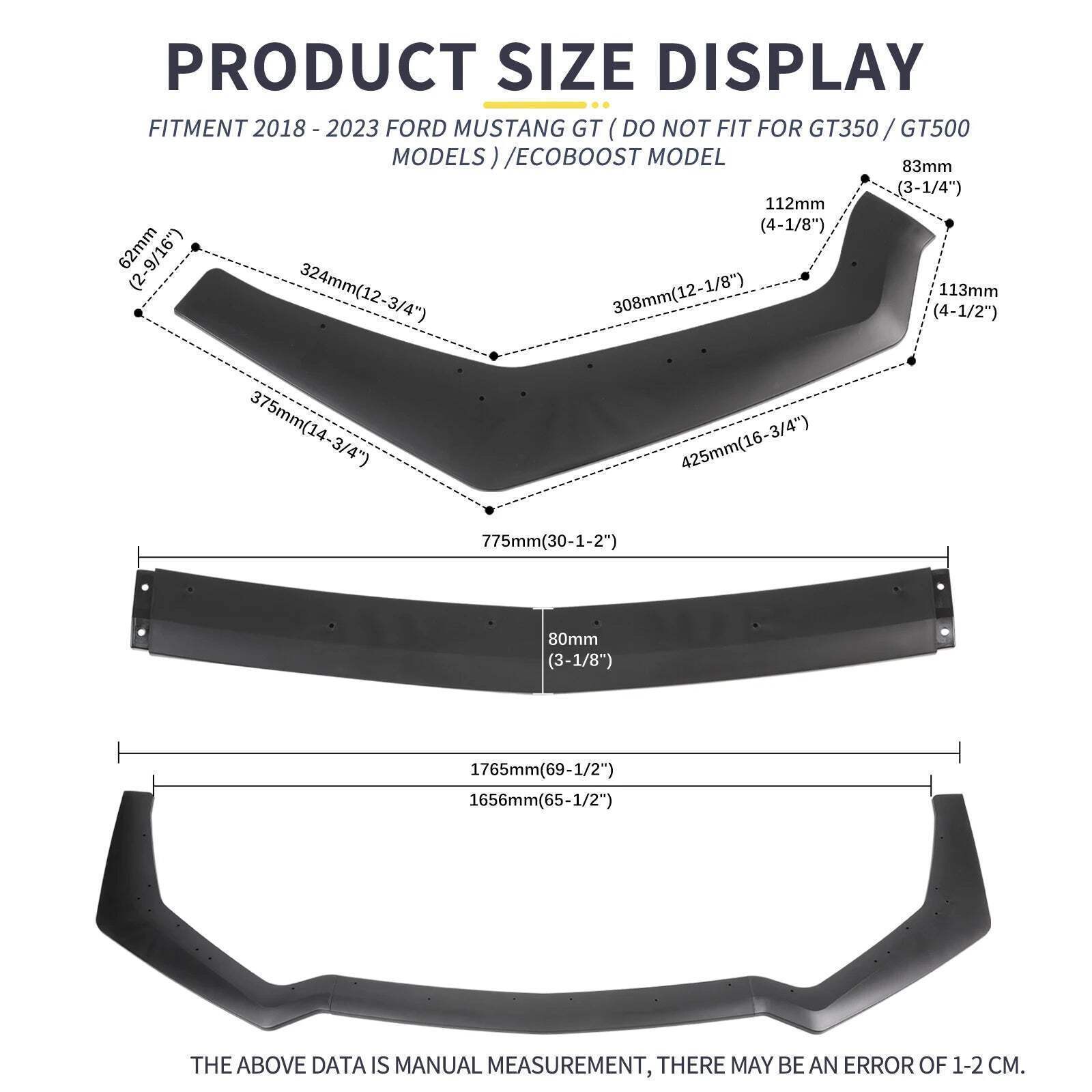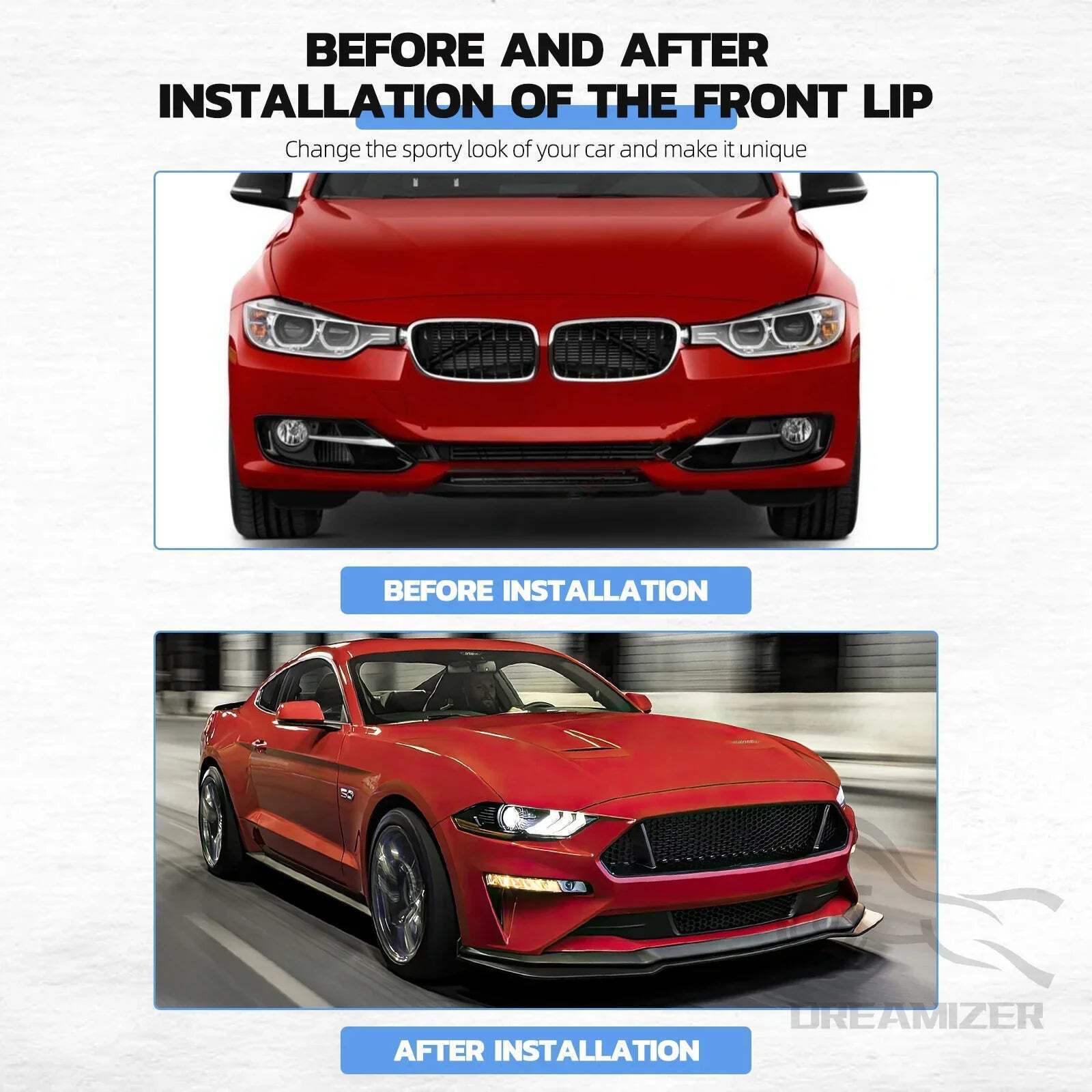 Enhance the look and performance of your Ford Mustang GT (2018-2023) with this compatible 3-piece front bumper lip spoiler. Crafted from lightweight and durable PP plastic, this splitter body kit adds a sporty and aggressive appearance while offering extra protection for your bumper. Designed for easy installation with no drilling required, it improves aerodynamic performance by reducing airflow under the car, making it more stable during high-speed driving. Perfect for Mustang owners looking to upgrade their style and functionality. Compatible with Ford Mustang GT models from 2018-2023 for a precise and seamless fit. Made from durable and lightweight PP plastic for long-lasting performance and impact resistance. Easy to install with included hardware?no drilling required, ensuring quick setup. Improves aerodynamics by reducing airflow under the car, enhancing stability at high speeds. Provides additional bumper protection against scratches and minor impacts while delivering a sporty look.