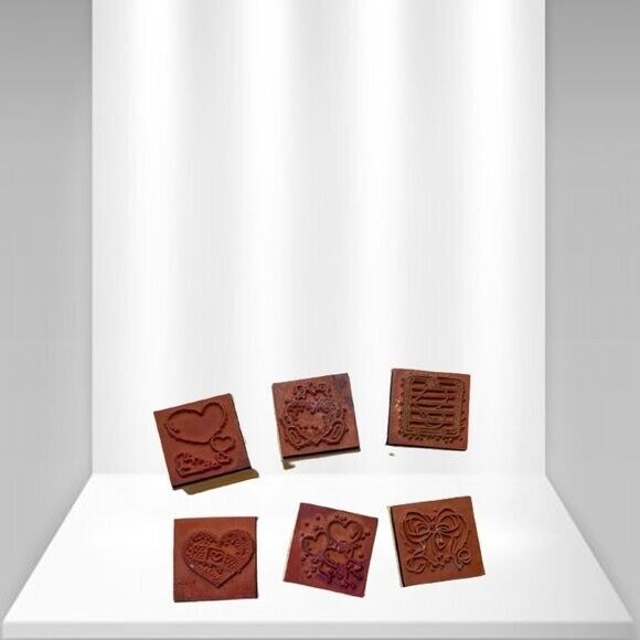 Set of 6 Vintage Wooden Rubber Stamps featuring intricately detailed Assorted Heart Designs. Crafted with wood backs and quality rubber, these stamps are a wonderful collection from the year 2008.