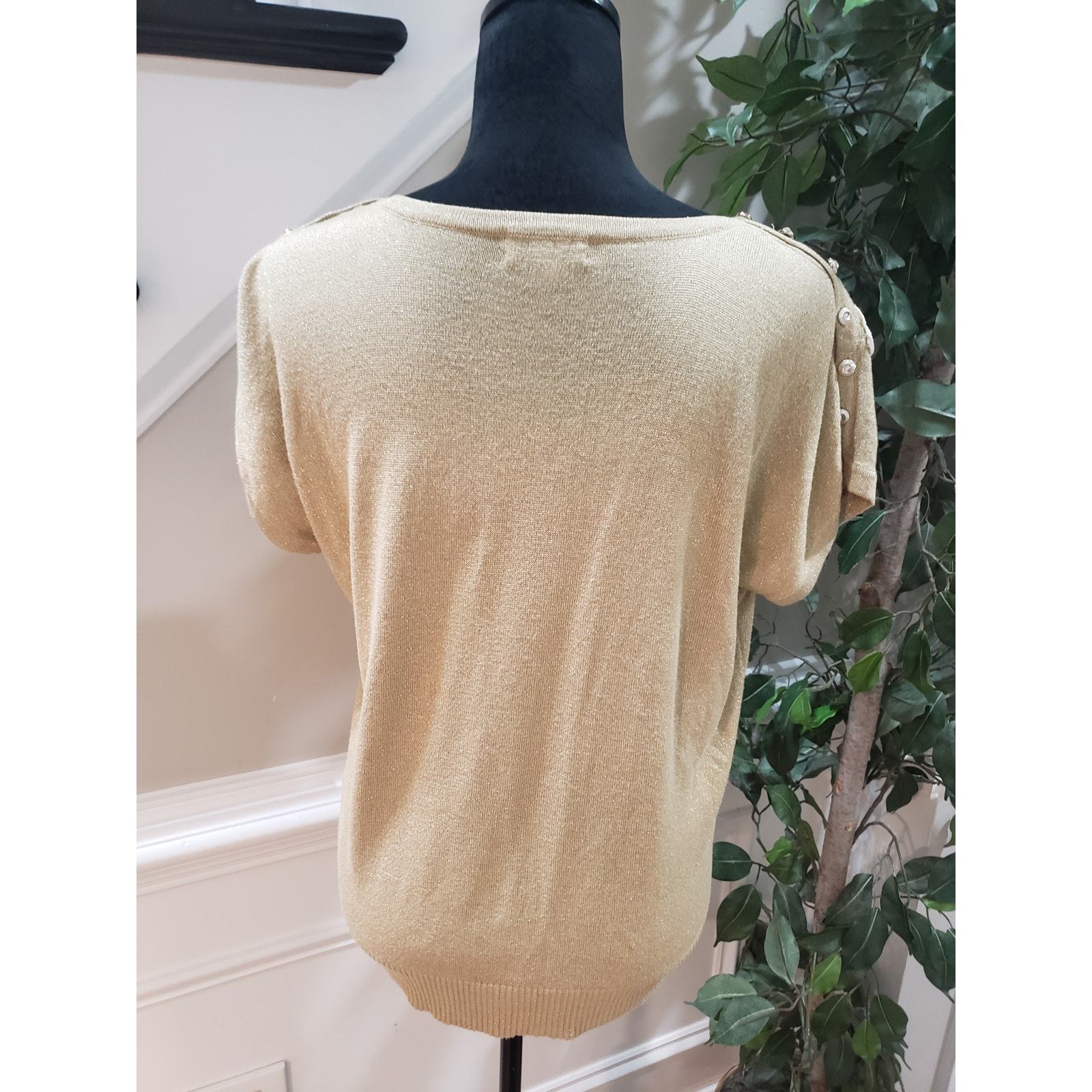 Joseph A. Blouse Top Women M Beige Metallic Floral Short Sleeve Shoulder Buttons
