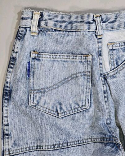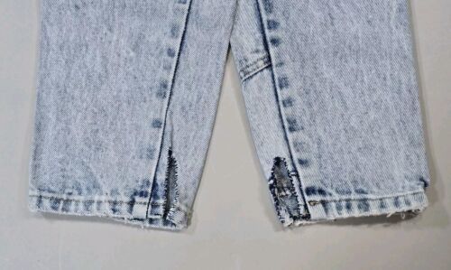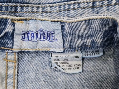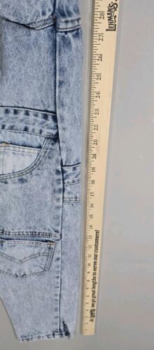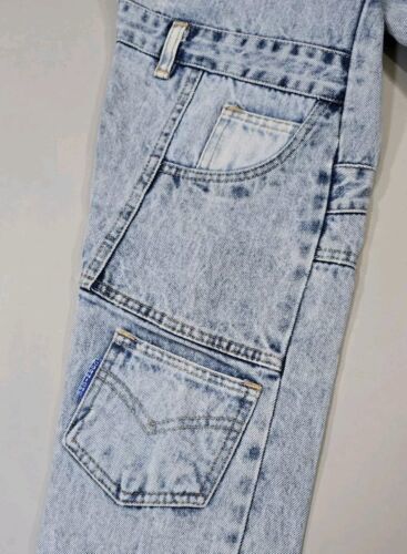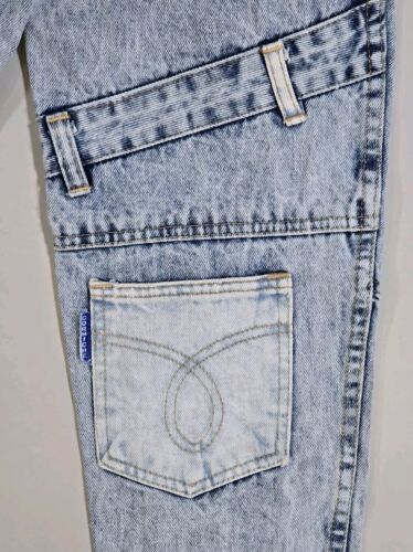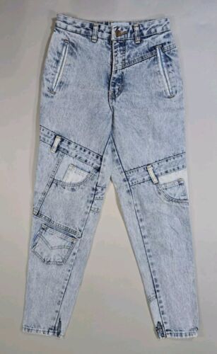Please note hole in photo three above back left pocket. Step into retro style with these Vintage 90s Corniche jeans, boasting a size 3/4 (24x27.5) fit that's perfect for making a statement. The acid-wash denim gives these blue jeans an effortlessly cool vibe, while the patchwork design, complete with pockets and logo accents, adds a touch of individuality to your ensemble.