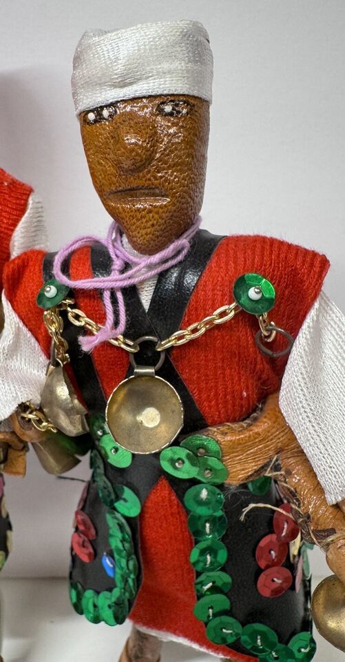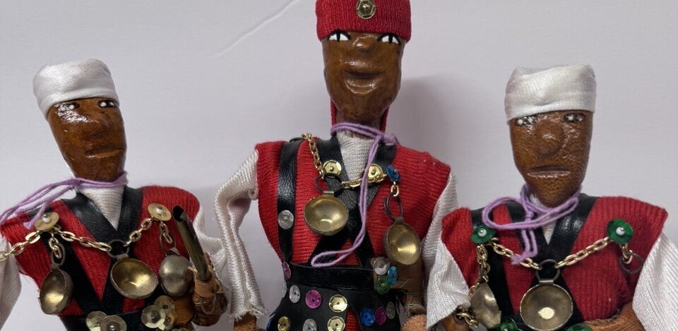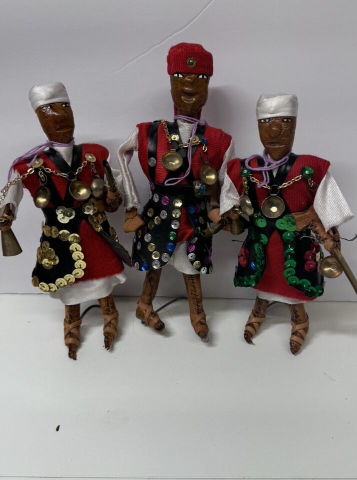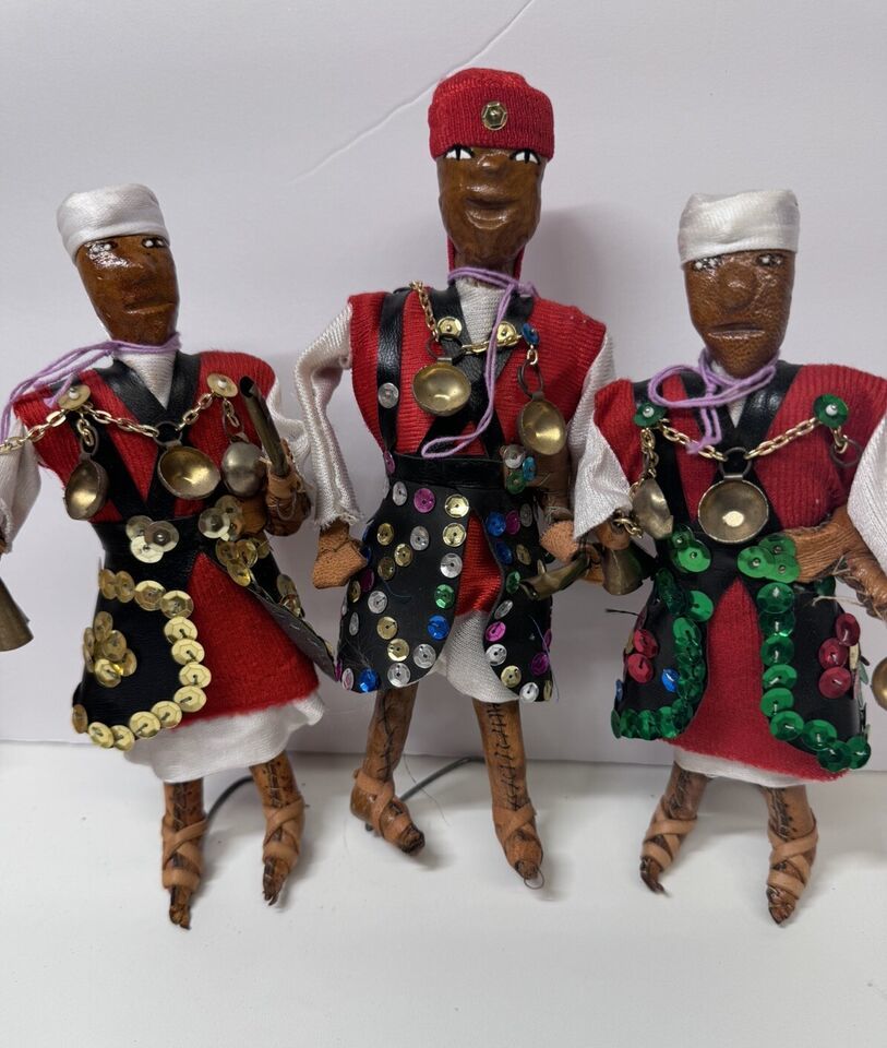 Add a touch of culture and ethnicity to your collection with this beautiful set of 3 vintage Moroccan folk art dolls. These handmade leather dolls are crafted with intricate details and vibrant colors that capture the essence of Moroccan tradition. Perfect for all occasions, these dolls are ideal for collectors and enthusiasts alike.