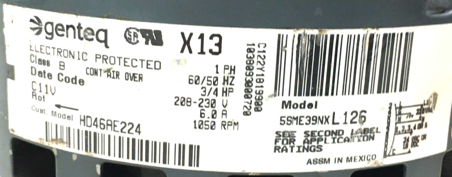 This is Genteq 5SME39NXL126 230V 3/4 HP 1050 RPM Carrier p/n HD46AE224 Blower Motor with X13 FM18 programmed for CCW Lead End rotation, used part.