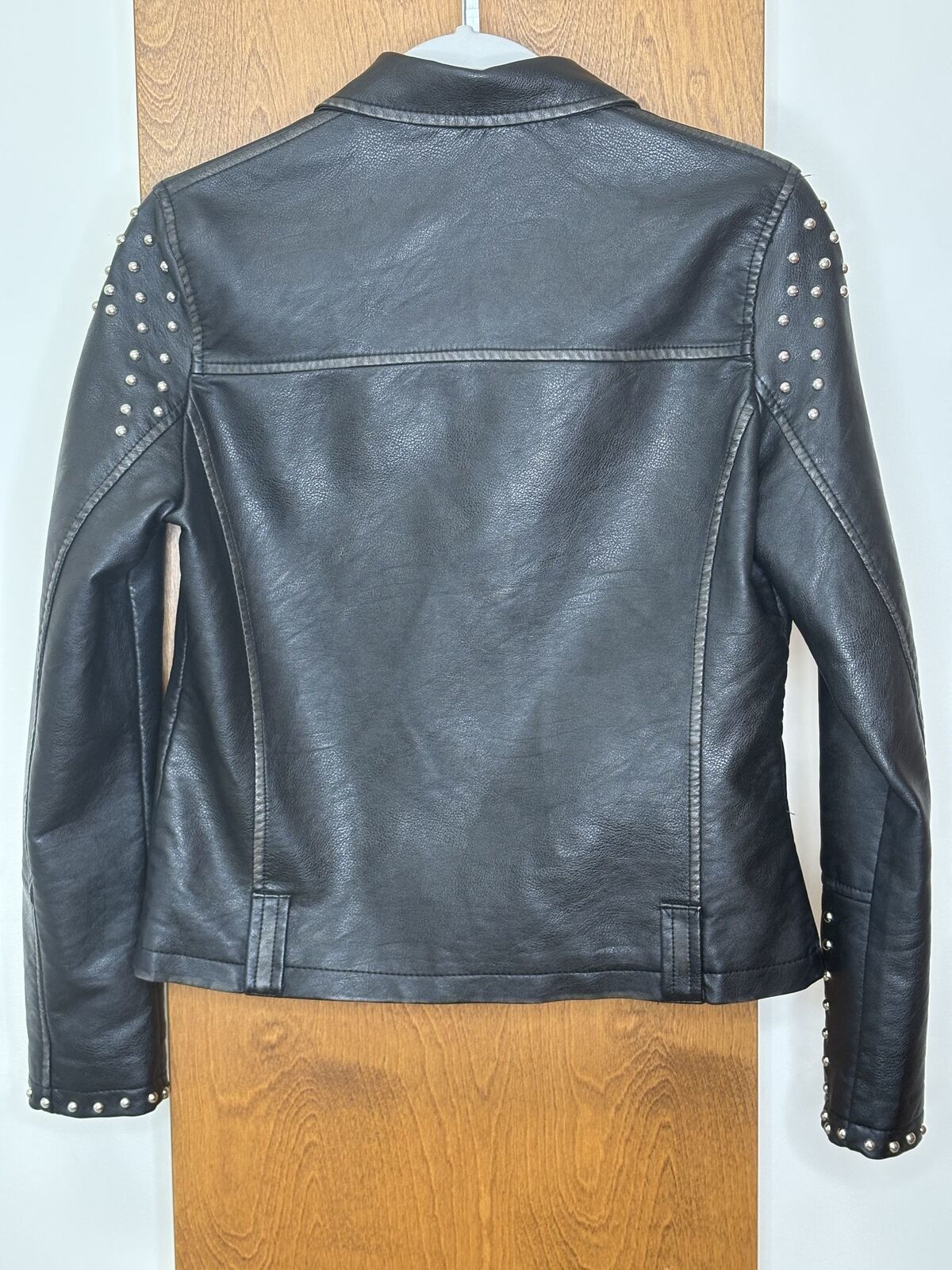 Studded Black Faux Leather Biker Jacket Zippered Cuffs Dex Size Small -NO BELT