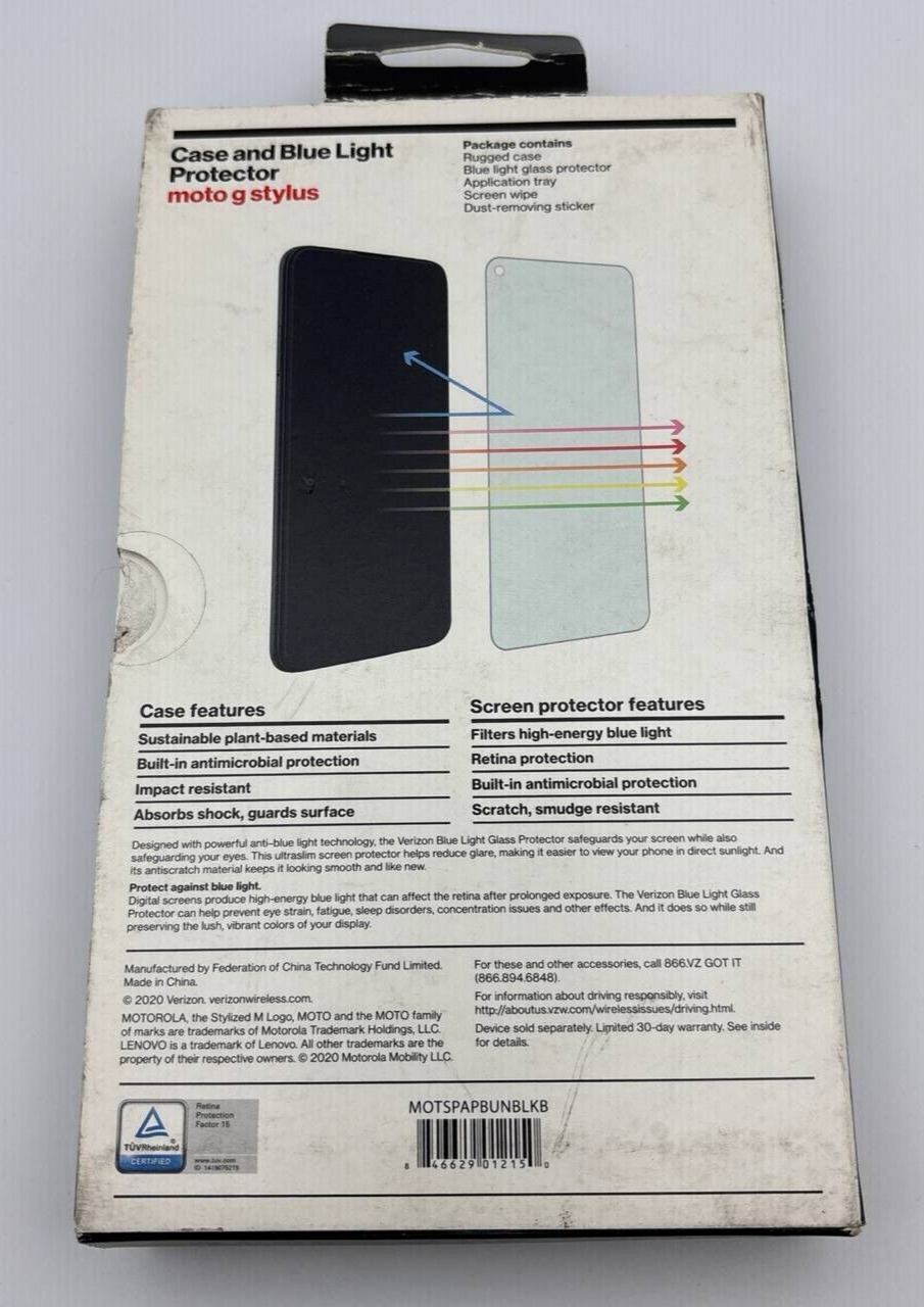 Item includes: Verizon Rugged Case and Blue Light Screen Protector for Motorola Moto G Stylus.