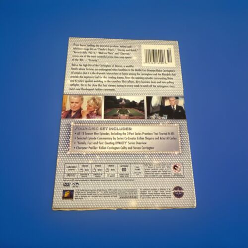 The "Dynasty: Complete First Season DVD - 4 Disc Set" is a box set edition of the 1981 TV series "Dynasty." It includes the entire first season with a total run time of 719 minutes. The DVD format has an NTSC video format with an aspect ratio of 4:3, featuring actors John Forsythe and Linda Evans in a drama and romance genre. The set also offers English and Spanish subtitles, commentary, and full-screen viewing. The release year is 2005, and it is produced by 20th Century Fox.Please look at our store for unique collectibles and quality vintage items.