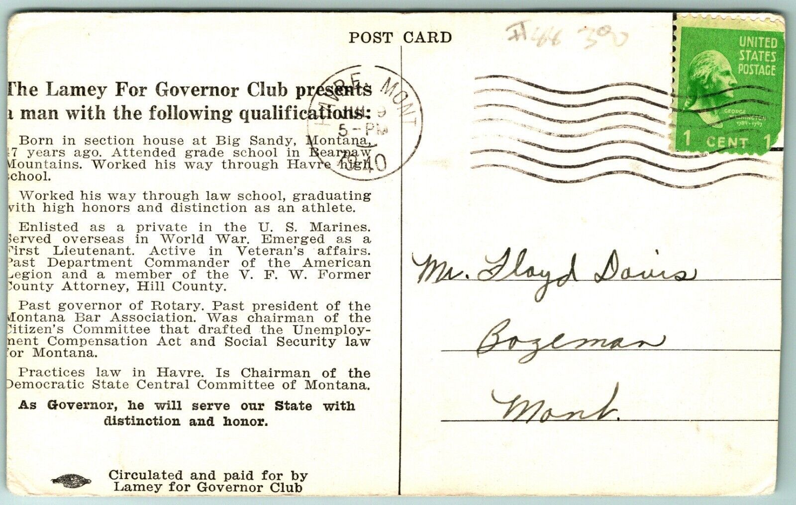 Lamey For Governor Election Advertising Havre Montana MT 1940 Postcard J11