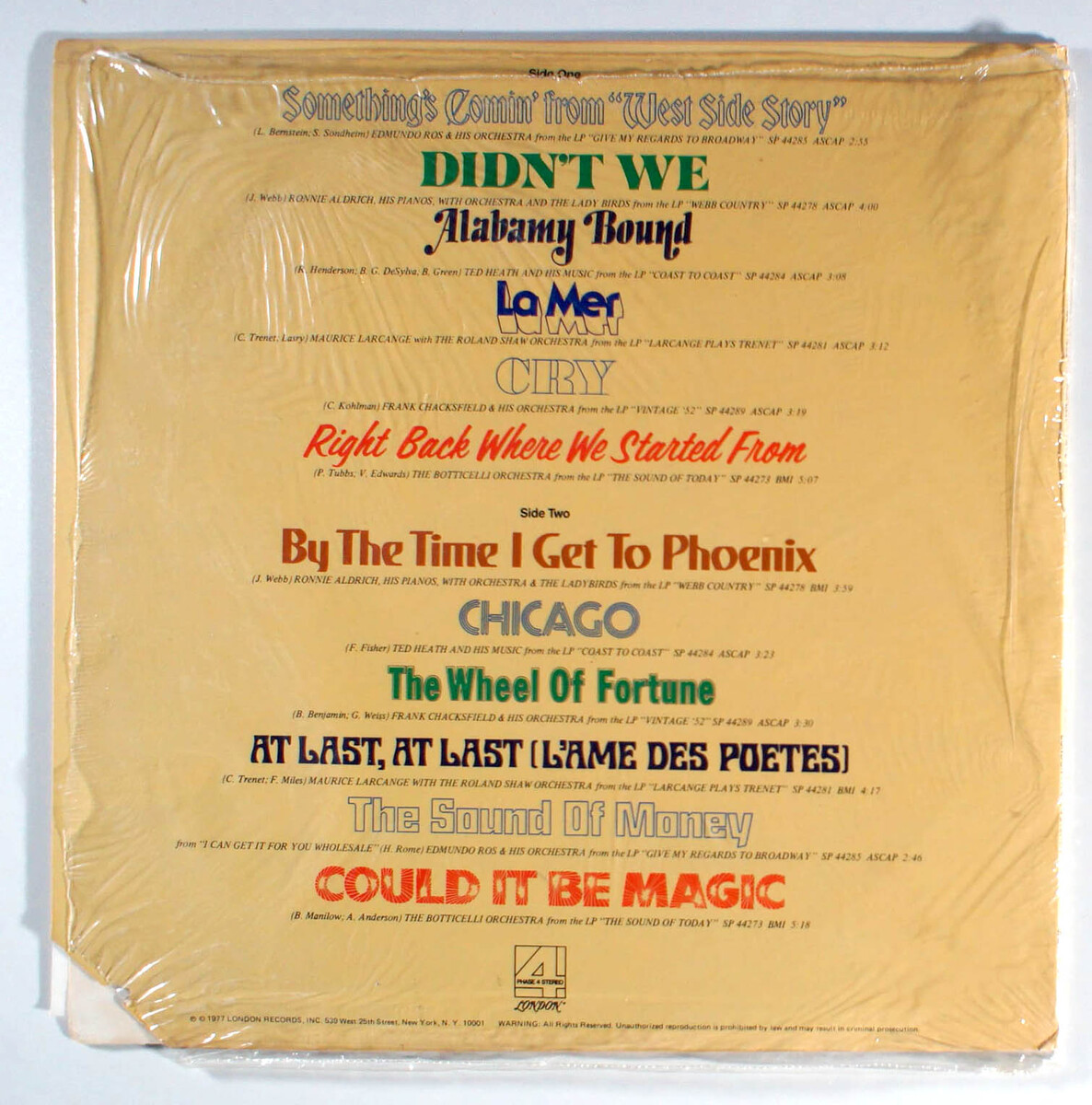 London Phase 4 Sampler: Fall will serve as an introduction to the latest Phase 4 stereo releases. Presented are twelve recordings such as Something's Coming from West Side Story, Chicago by Ted Heath and By the Time I Get to Phoenix by Ronnie Aldrich.