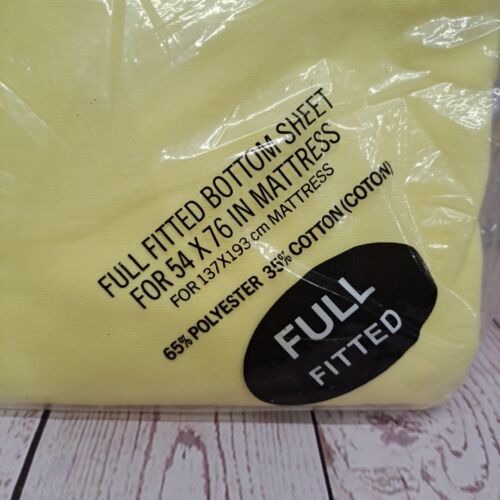 This vintage Cannon Monticello full fitted sheet in yellow is designed for a 54"x76" mattress. Made in the USA from a polyester and cotton blend, it features a solid color style with a vintage aesthetic. The set includes a fitted sheet and is a new old stock (NOS) item. Perfect for adding a touch of period style to your bedding collection.
