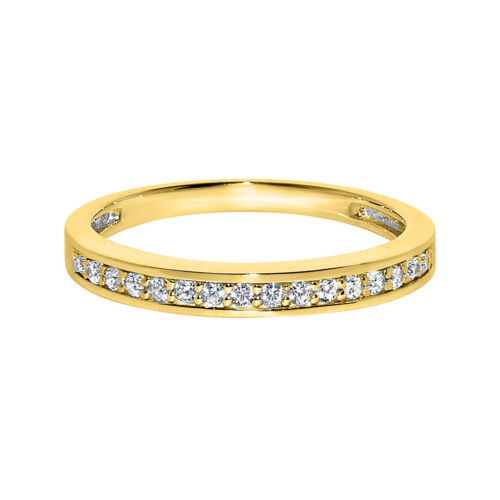 This remarkable straight band is a testament to timeless elegance, crafted from gleaming 14k yellow solid gold. Imagine a captivating row of prong-set round brilliant-cut Diamonette - Diamond Simulant stones nestled within a shining solid channel. Each Diamonette, with a brilliance that rivals a natural diamond, boasts a combined carat weight equivalent to 0.2 carats.