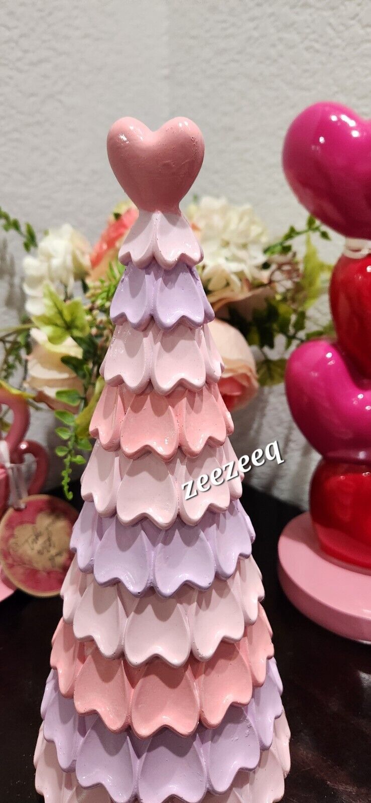 Up for sale we have this adorable Valentines tree for your tabletop decor. This tree has tiered pastel hearts in pink and lavender. Made of resin it stands approx 12" tall. New