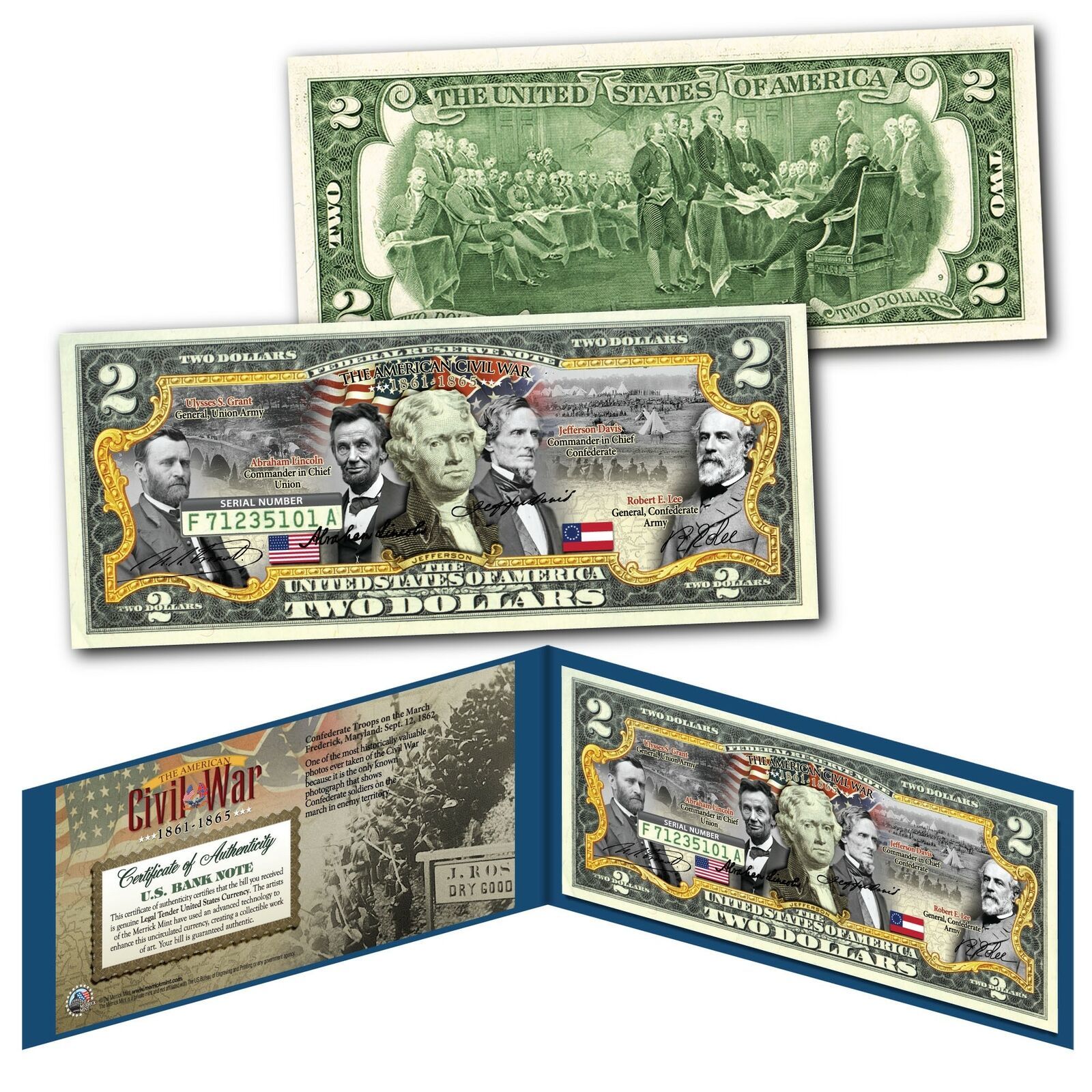 This American CIVIL WAR Confederate Union Generals/Commanders uncirculated $2 Bill is Genuine Authentic Legal Tender of the United States, which has been enhanced with colorized images of the most important Confederate Union Generals/Commanders. The general officers of the Confederate States Army were the senior military leaders of the Confederacy during the American Civil War of 1861?1865. The southern generals were the commanders that led the troops and made decisions for the South during battles. The Union Army, or Federal Army as it was also known, was the United States Army land force that fought to keep and preserve the Union of the collective states, proving essential in the preserving of the United States of America as a working, viable republic. The northern generals were the commanders that led the troops in the North and helped decide the ultimate outcome of most civil war battles. To the end, The Union Army bravely fought and ultimately triumphed over the efforts of the Confederate Army in the American Civil War. This bill features images of the most important leaders of the Confederate, Robert E. Lee and Jefferson Davis and the most important Union leaders, Abraham Lincoln and Ulysses S. Grant. These colorized images are accomplished through a revolutionary new authentic genuine colorization process pioneered by The Merrick Mint. Included is a blue display portfolio plus a Certificate of Authenticity to guaranty that your bills are authentic and recognized by every monetary authority around the world, and assuring its Collector Edition status. Only genuine Legal Tender $2 United States Bills are used for this unique colorization process. Each $2 Bill is in FRESH, CRISP, UNCIRCULATED condition, and was directly removed from untouched wrapped Federal Reserve sealed packs. Former U.S. President Thomas Jefferson is featured on the obverse of the note, along with the special colorization overlay. The Signing of the Declaration of Independence by John Trumbull is featured on the reverse. It is the only U.S. Currency note that features two Presidents, John Adams and Thomas Jefferson, and it is one of the most rarely seen BILLS in circulation and actual use.