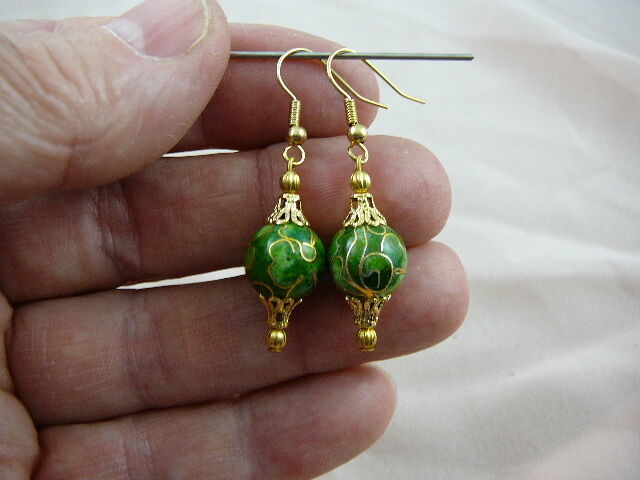 CLOISONNE EARRINGS, CHINA: Here's how a cloisonne bead is made: A copper body is hammered and welded. Then wire "cells" (where the word "cloisonne" came from) are formed and soldered on the copper body. Preliminary enamel filling and firing is completed (numerous colors of enamels are used in a single bead). Then 3 or more thin layers of enameling are filled and fired (never a heavy layer since it will bubble up and burn). Grinding off of excess enamel is done, then preliminary polishing, then final polishing. Finally, 24 k gold electroplating is done to complete the gilding of the cloisonne bead, which adheres to all the brass wired "cells" to make a beautiful work of art in each bead!