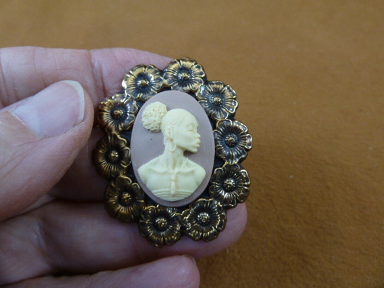 (Internal #CA10-230) Excellent side-view cameo of an African-American woman. New, molded from resin, this is a medium cameo pin/pendant in OFF-WHITE color with LIGHT MAUVE color background, mounted on oval shaped brass with daisy flower trim design. Cameo itself is 1" long x 3/4" wide or 25 x 18 mm. Clasp pin/pendant glued horizontally on the back (see last photo for an example).
