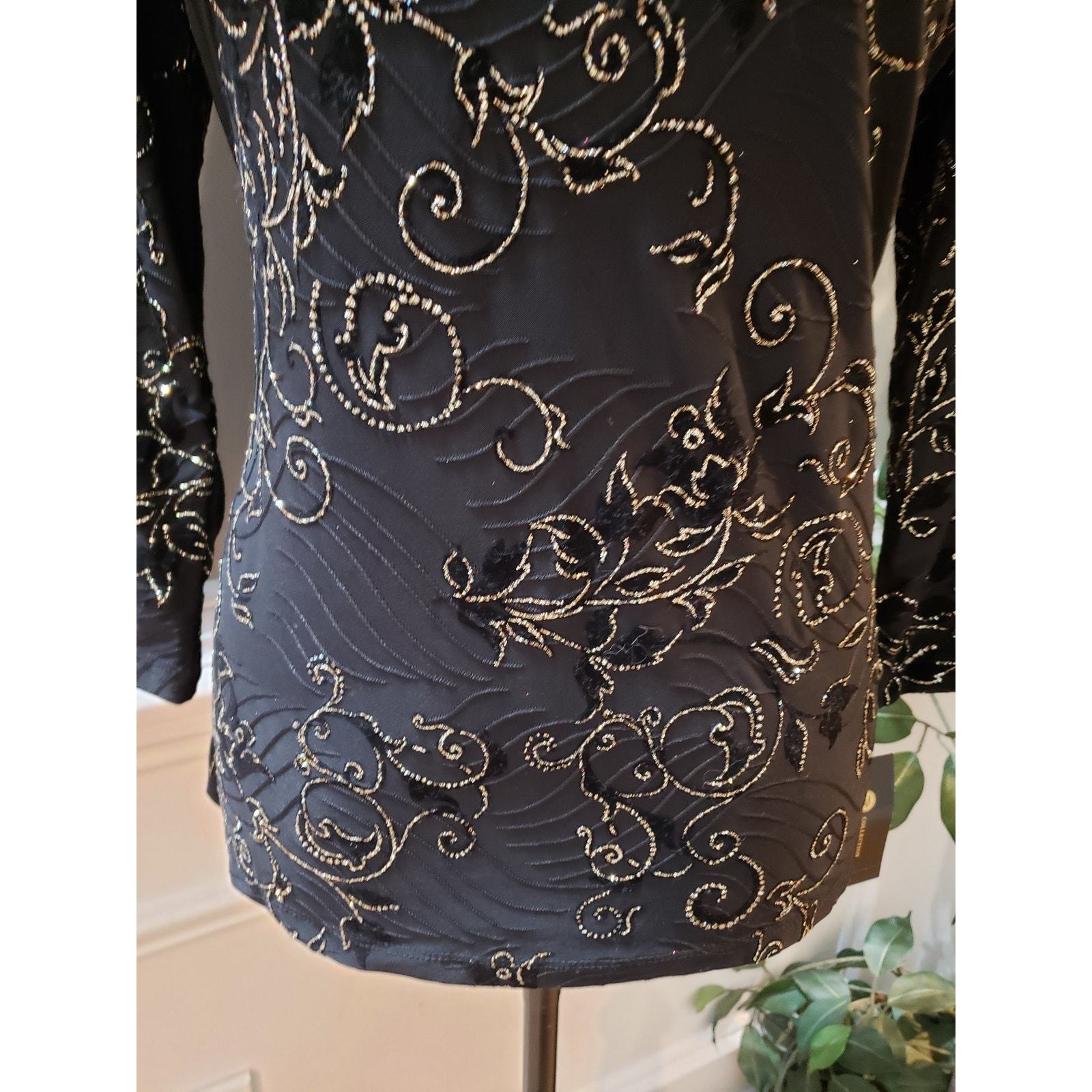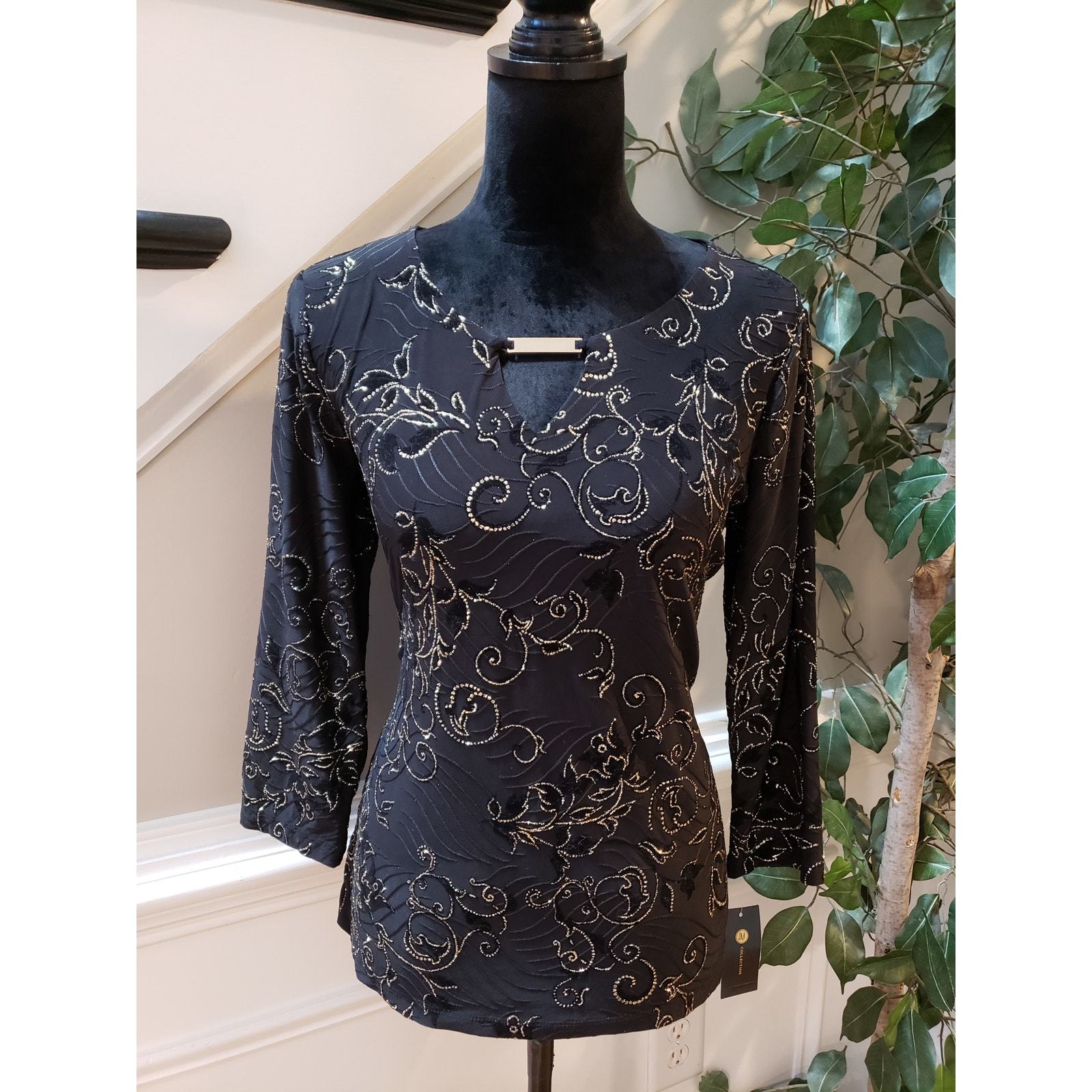 JM Collection Blouse Top Womens Small Deep Black Jacquard Keyhole Front Pullover
