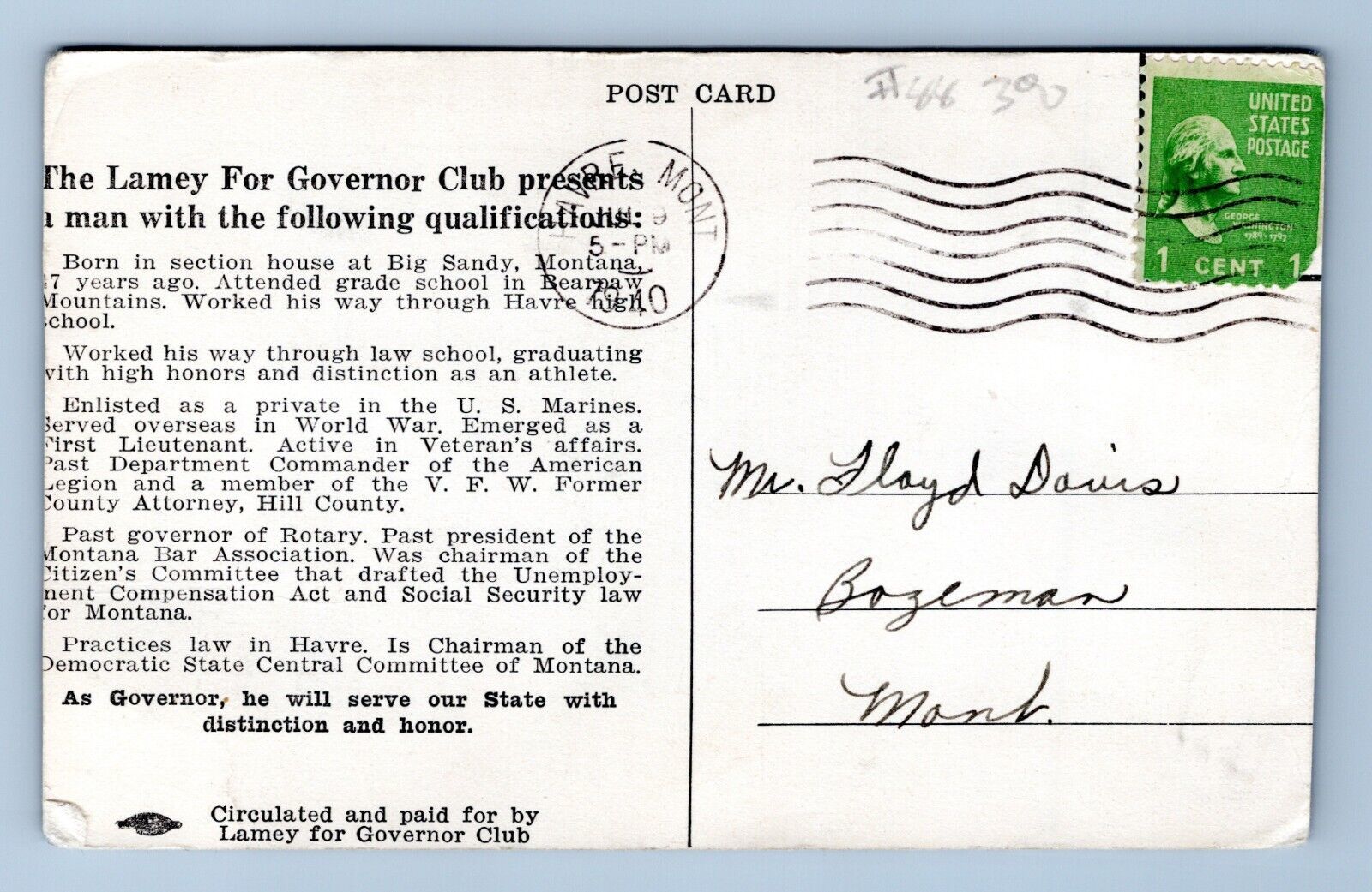 Lamey For Governor Election Advertising Havre Montana MT 1940 Postcard L15