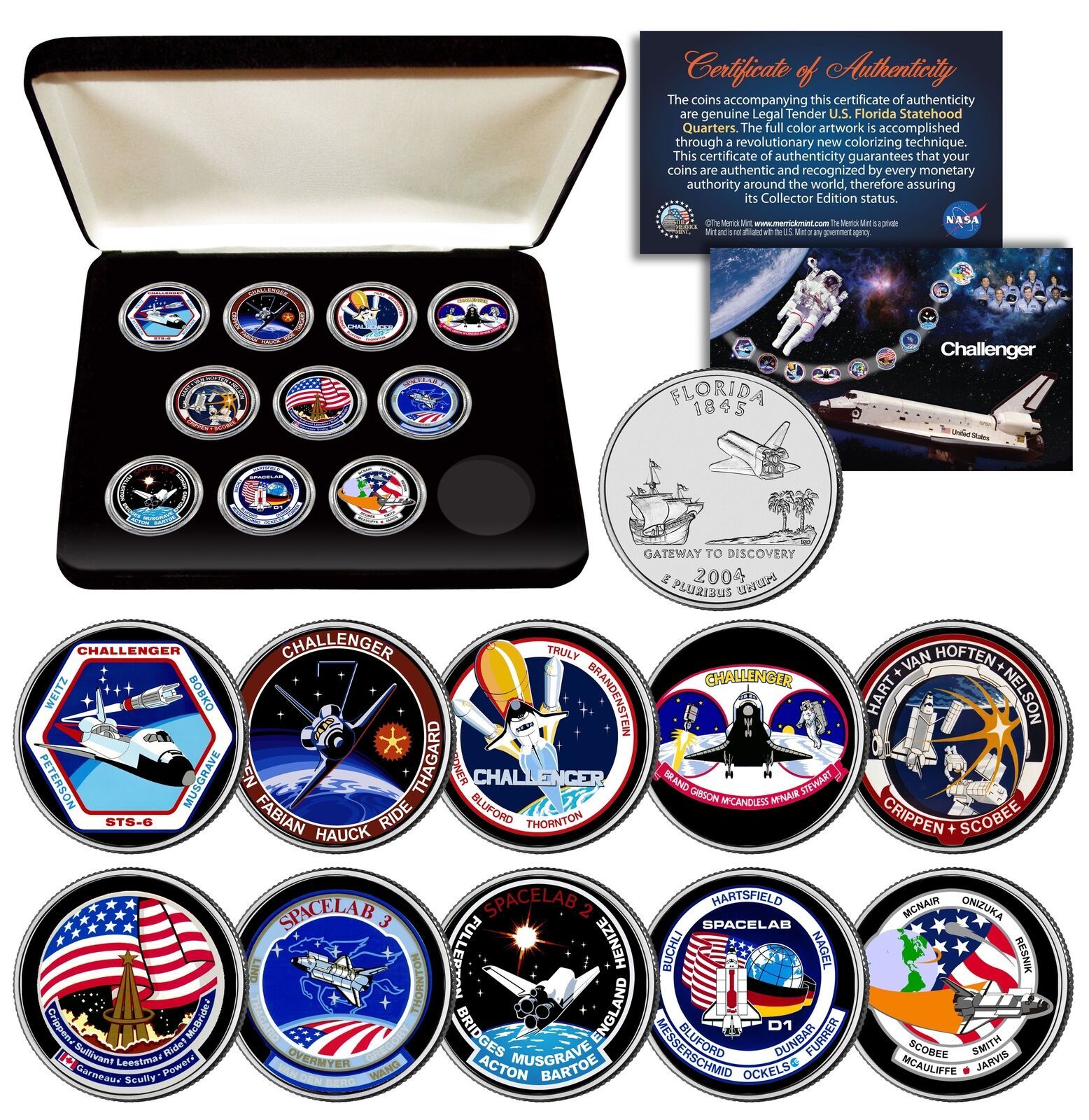 Space Shuttle Challenger was the second orbiter of NASA's space shuttle program to be put into service following Columbia. Here is your chance to own a complete set of ten (10) colorized 2004 Florida Statehood Quarters U.S. Coins of the SPACE SHUTTLE CHALLENGER MISSIONS. These high-quality, genuine Legal Tender United States coins have been colorized using a unique painstaking multicolor authentic process by the Merrick Mint. Colorizing coins involves the unique application of special inks directly to the surface of a coin that achieves a level of detail, color saturation, and durability that is #1 in the coin industry. The result is an everlasting colorized coin collectible of ultra-high quality. Each coin features an emblematic design of Florida State on the reverse and colorized mission insignia image on the obverse (portrait of George Washington design). Each coin comes in a premium coin capsule. The 10-coin set comes with a Certificate of Authenticity to guarantee that your coins are authentic and recognized by every monetary authority around the world, assuring its Collector Edition status.