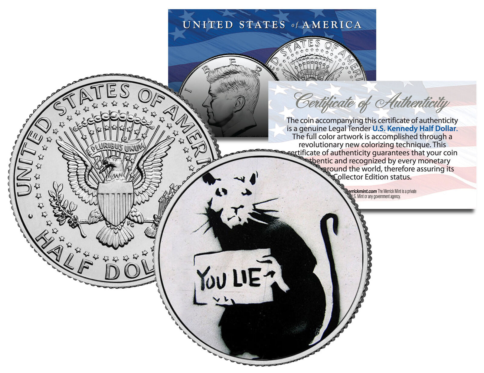 Here is your opportunity to own or to gift the BANKSY - YOU LIE RAT colorized JFK Kennedy Half Dollar U.S. Coin, which has been enhanced with a beautifully colorized image by the Merrick Mint. Each coin comes in a premium coin capsule with a full color Certificate of Authenticity to guarantee that your coin is authentic and recognized by every monetary authority around the world, assuring its Collector Edition status. This Legal Tender United States coin has been colorized with an application of special inks directly to the surface of the coin, using a unique and painstakingly multicolor coin process, which achieves a level of detail, color saturation, and durability that is #1 in the coin industry. The result is an everlasting colorized coin collectible of ultra-high quality.