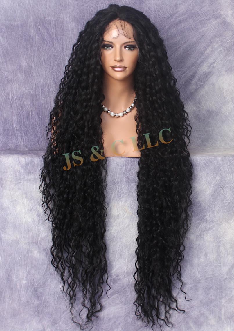Ex Long Black Human Blend Lace Front Wig Water Waves Center Part Monofilament pa