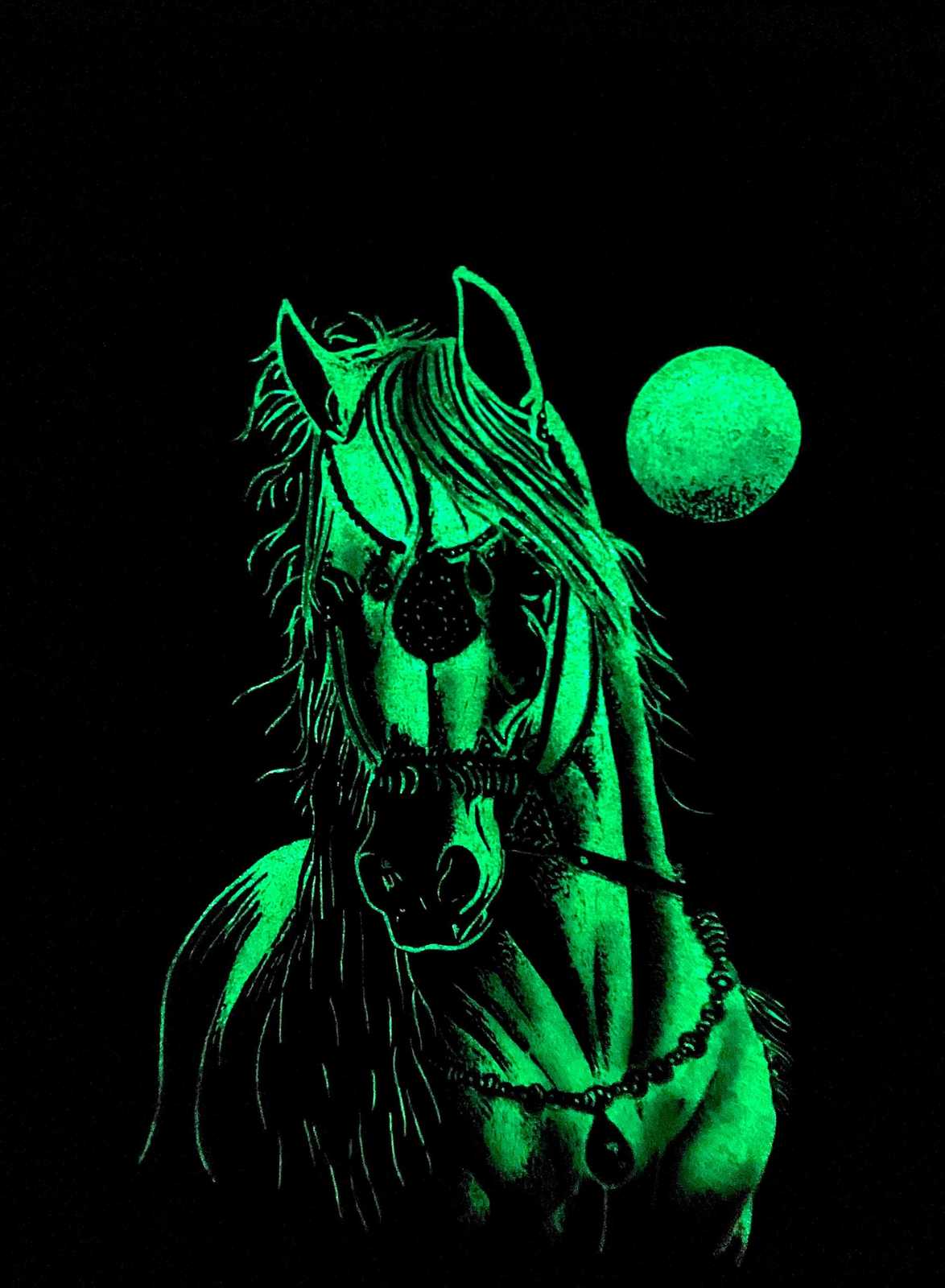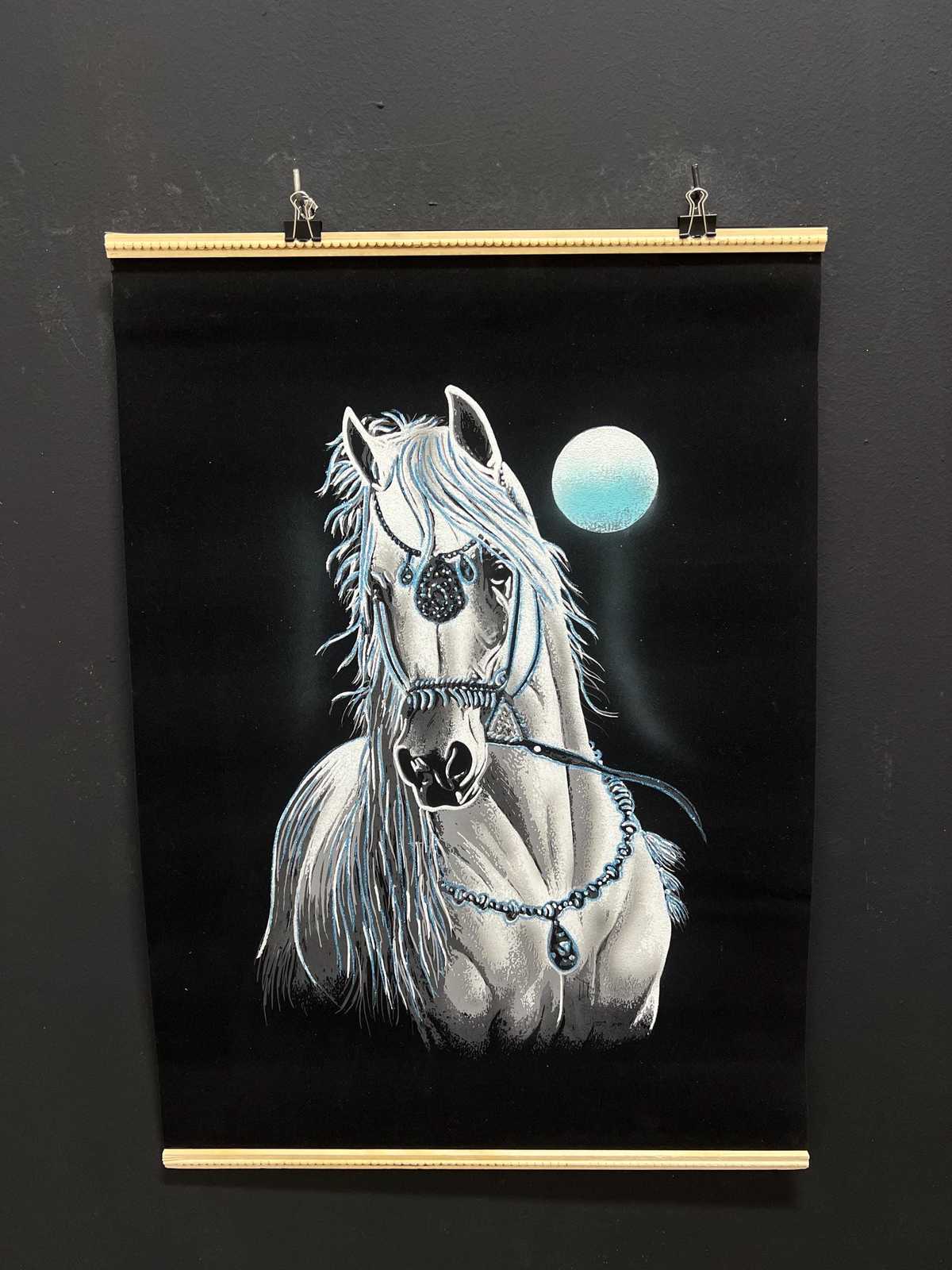 Elevate your space with this exquisite hand-painted black velvet artwork featuring a beautiful horse illuminated by the enchanting glow of the moon. This striking piece captures the essence of grace and power, showcasing the majestic horse in a dazzling interplay of light and shadow.