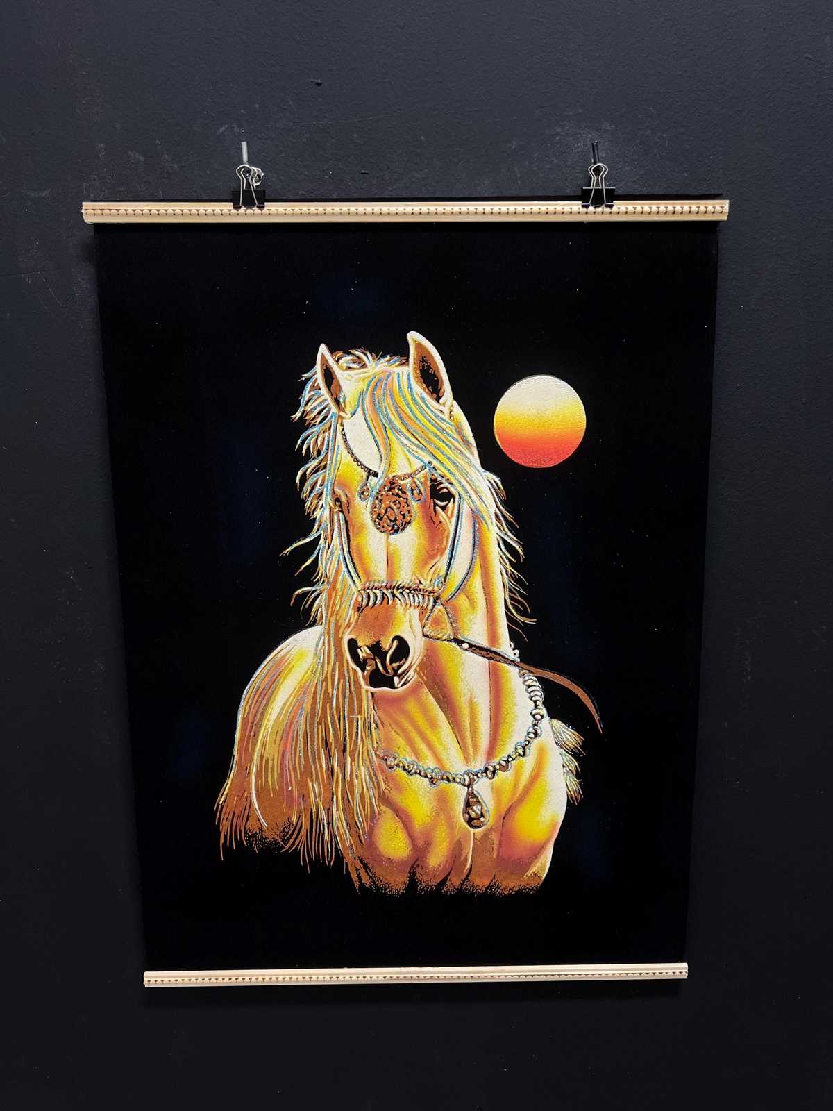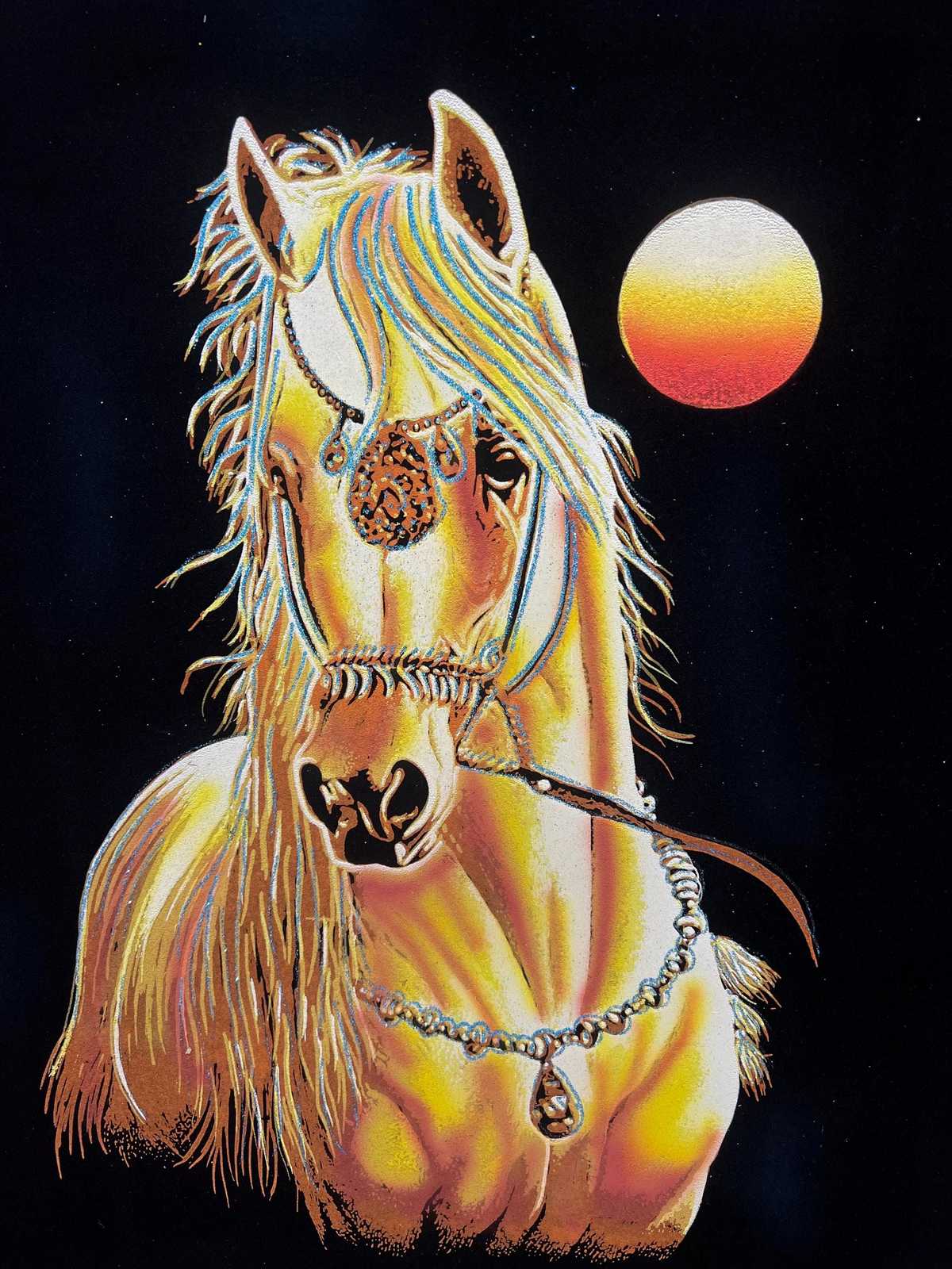 Elevate your space with this exquisite hand-painted black velvet artwork featuring a beautiful horse illuminated by the enchanting glow of the moon. This striking piece captures the essence of grace and power, showcasing the majestic horse in a dazzling interplay of light and shadow.